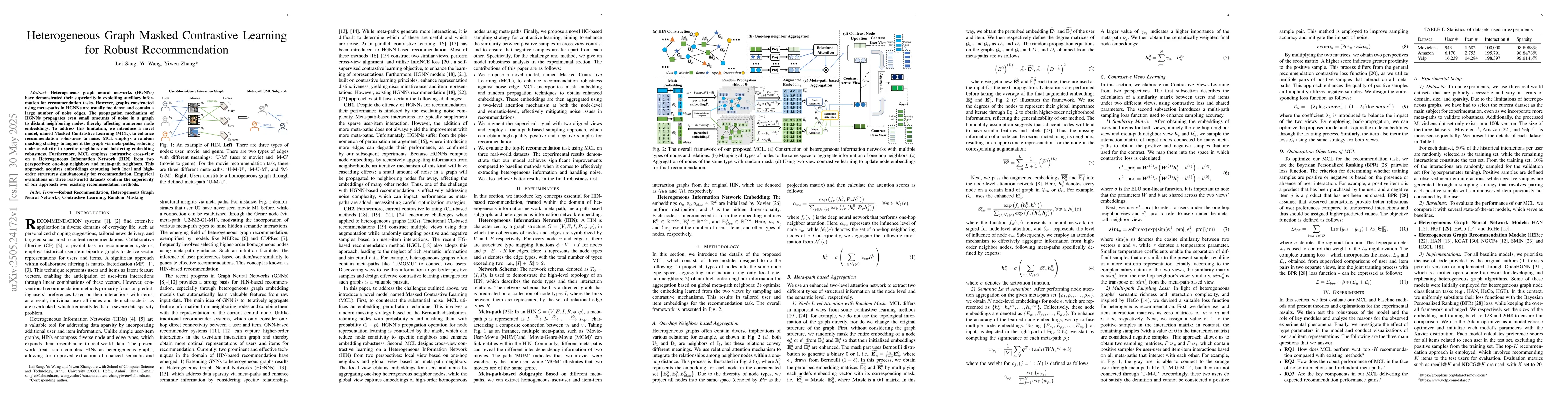 A new approach called Masked Contrastive Learning (MCL) improves recommendation robustness to noise in heterogeneous graph neural networks by masking parts of the graph and using contrastive learning from multiple perspectives. MCL outperforms existing methods on three real-world datasets.