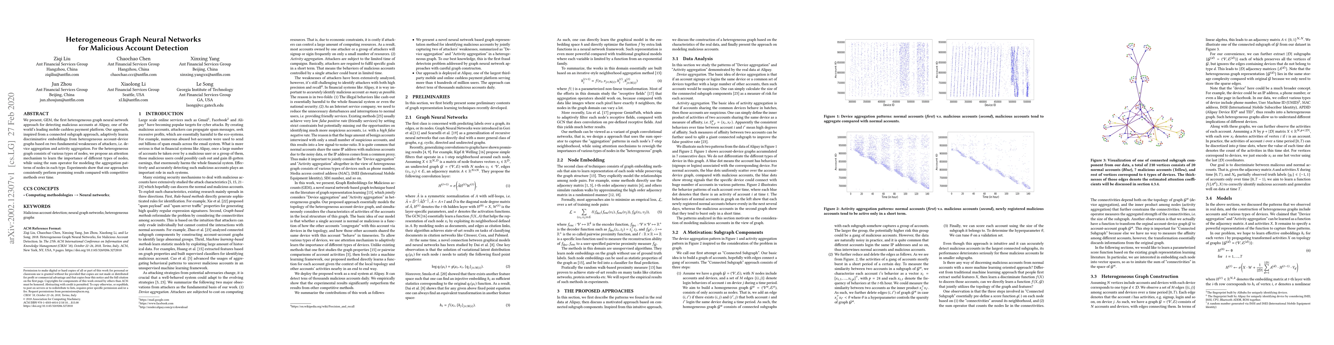 This paper introduces GEM, a heterogeneous graph neural network for detecting malicious accounts on Alipay. It leverages an adaptive embedding method based on device and activity aggregation patterns, employing an attention mechanism to prioritize different node types. Experimental results show superior performance over existing methods.