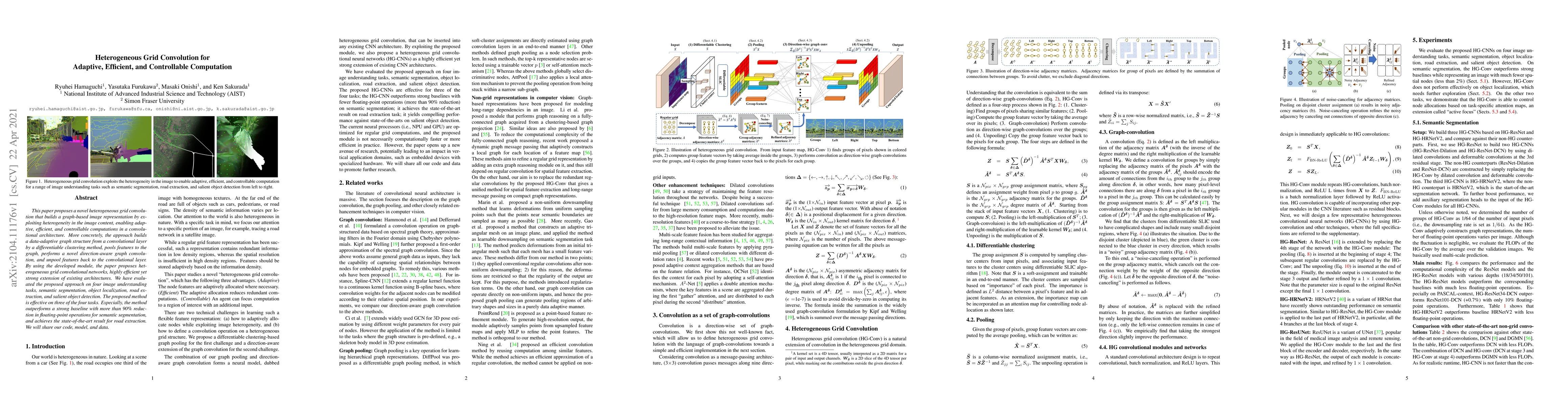 This paper proposes a novel heterogeneous grid convolution that builds a graph-based image representation by exploiting heterogeneity in the image content, enabling adaptive, efficient, and controllable computations in a convolutional architecture. More concretely, the approach builds a data-adaptive graph structure from a convolutional layer by a differentiable clustering method, pools features to the graph, performs a novel direction-aware graph convolution, and unpool features back to the convolutional layer. By using the developed module, the paper proposes heterogeneous grid convolutional networks, highly efficient yet strong extension of existing architectures. We have evaluated the proposed approach on four image understanding tasks, semantic segmentation, object localization, road extraction, and salient object detection. The proposed method is effective on three of the four tasks. Especially, the method outperforms a strong baseline with more than 90% reduction in floating-point operations for semantic segmentation, and achieves the state-of-the-art result for road extraction. We will share our code, model, and data.