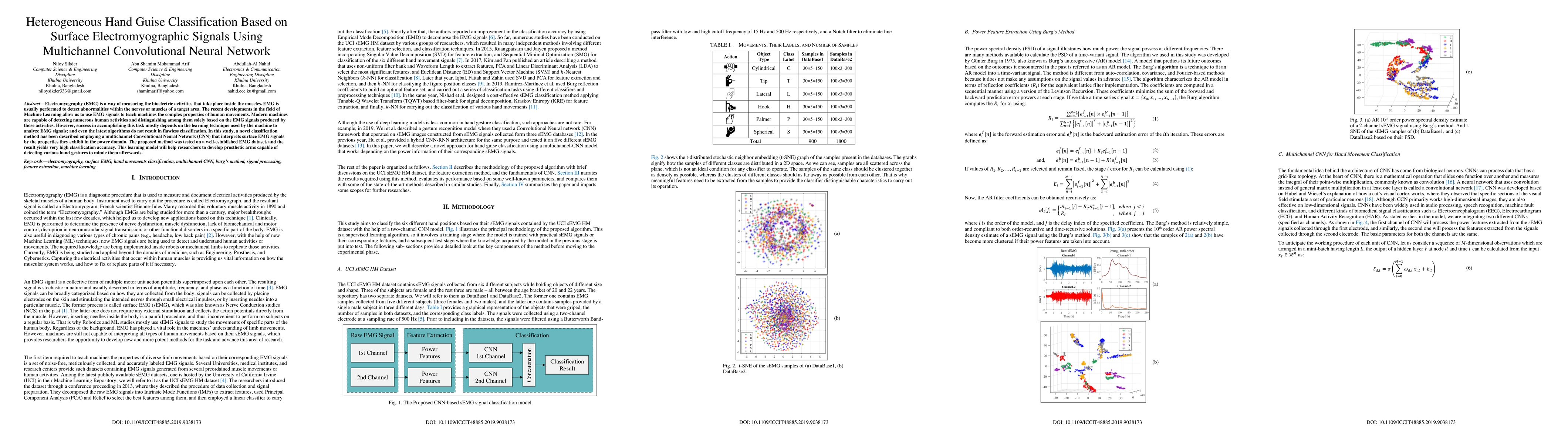 This paper proposes a multichannel Convolutional Neural Network (CNN) for classifying heterogeneous hand gestures based on surface EMG signals, achieving high classification accuracy. The method aims to enhance the development of prosthetic arms capable of detecting and mimicking various hand gestures.