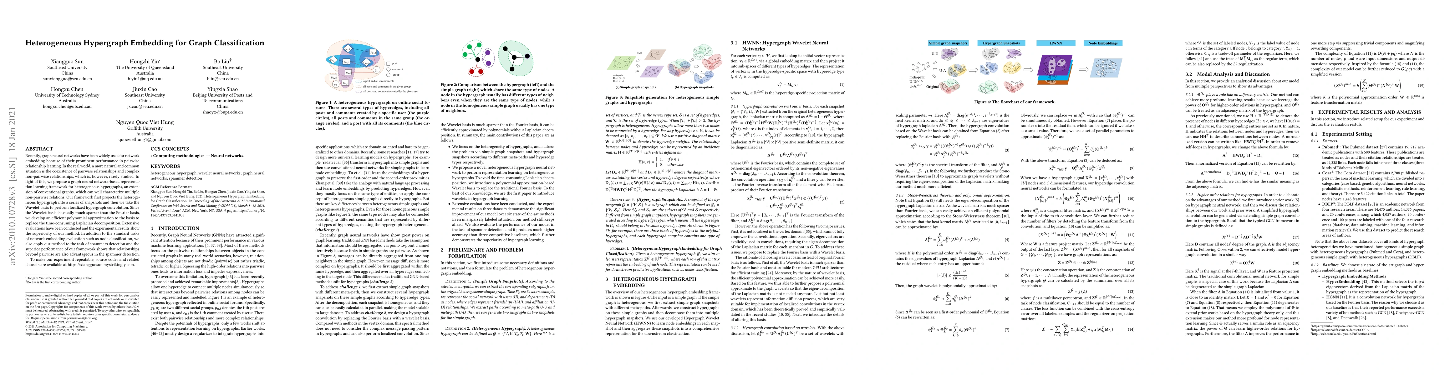 This paper proposes a novel graph neural network framework for embedding heterogeneous hypergraphs, which extends conventional graphs to better capture complex non-pairwise relationships. The method projects the hypergraph into snapshots and uses wavelet-based localized convolution, with an efficient polynomial approximation to improve computational efficiency, demonstrating superior performance in graph classification and spammer detection tasks.