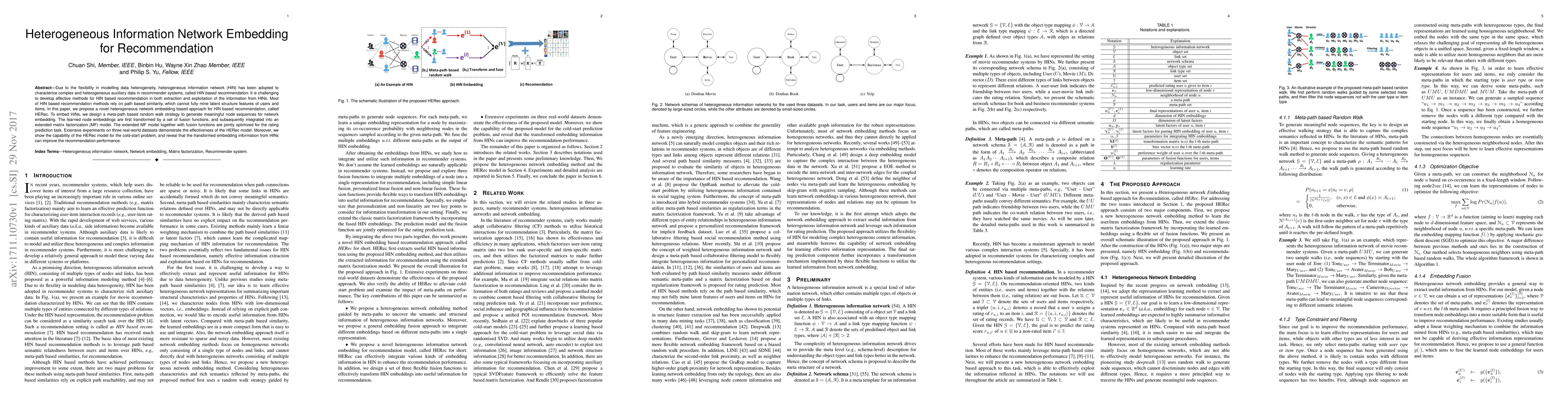 This paper proposes HERec, a novel approach for HIN-based recommendation that utilizes heterogeneous network embedding and meta-path based random walks to capture latent structures in complex data. The method integrates transformed embeddings into an extended matrix factorization model, demonstrating improved performance and cold-start capabilities through extensive experiments.