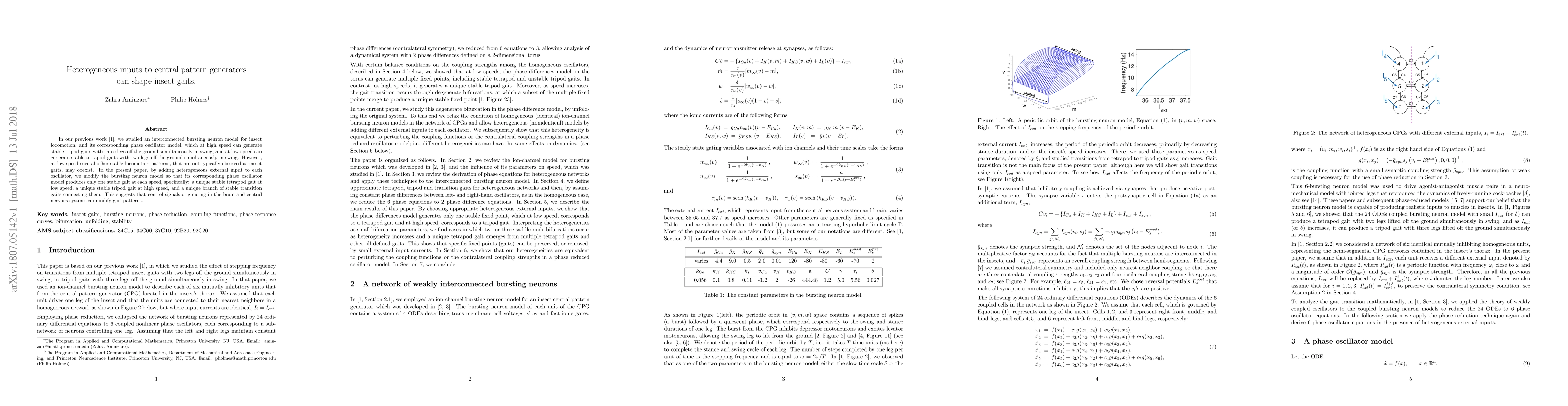 This paper modifies an insect locomotion model by introducing heterogeneous inputs to central pattern generators, resulting in a unique stable gait at each speed: a tetrapod gait at low speed, a tripod gait at high speed, and a transition gait in between. This suggests that brain-originated control signals can shape insect gait patterns.