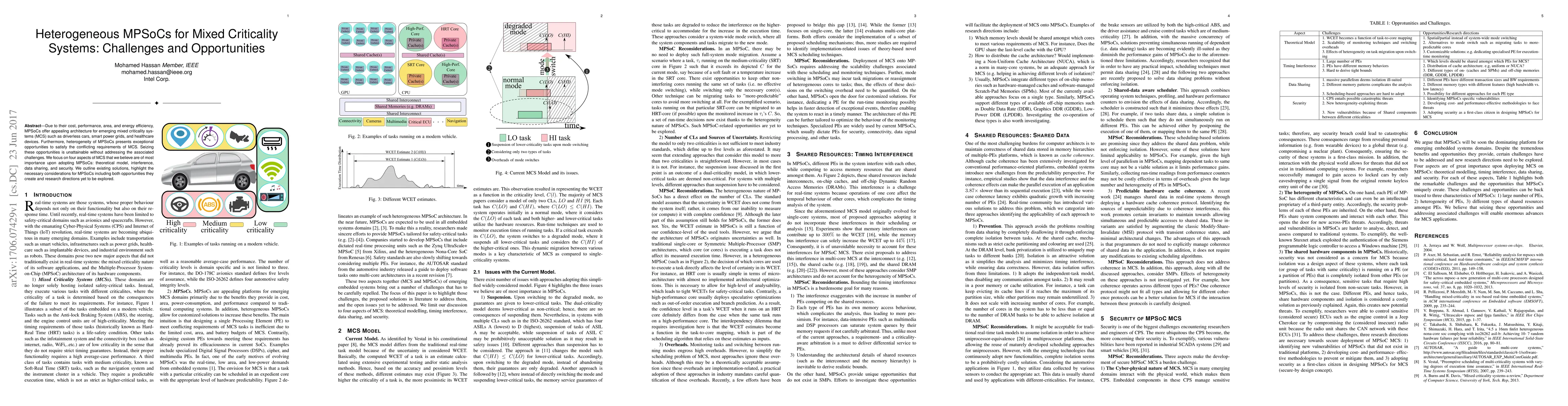 Due to their cost, performance, area, and energy efficiency, MPSoCs offer appealing architecture for emerging mixed criticality systems (MCS) such as driverless cars, smart power grids, and healthcare devices. Furthermore, heterogeneity of MPSoCs presents exceptional opportunities to satisfy the conflicting requirements of MCS. Seizing these opportunities is unattainable without addressing the associated challenges. We focus on four aspects of MCS that we believe are of most importance upon adopting MPSoCs: theoretical model, interference, data sharing, and security. We outline existing solutions, highlight the necessary considerations for MPSoCs including both opportunities they create and research directions yet to be explored.
