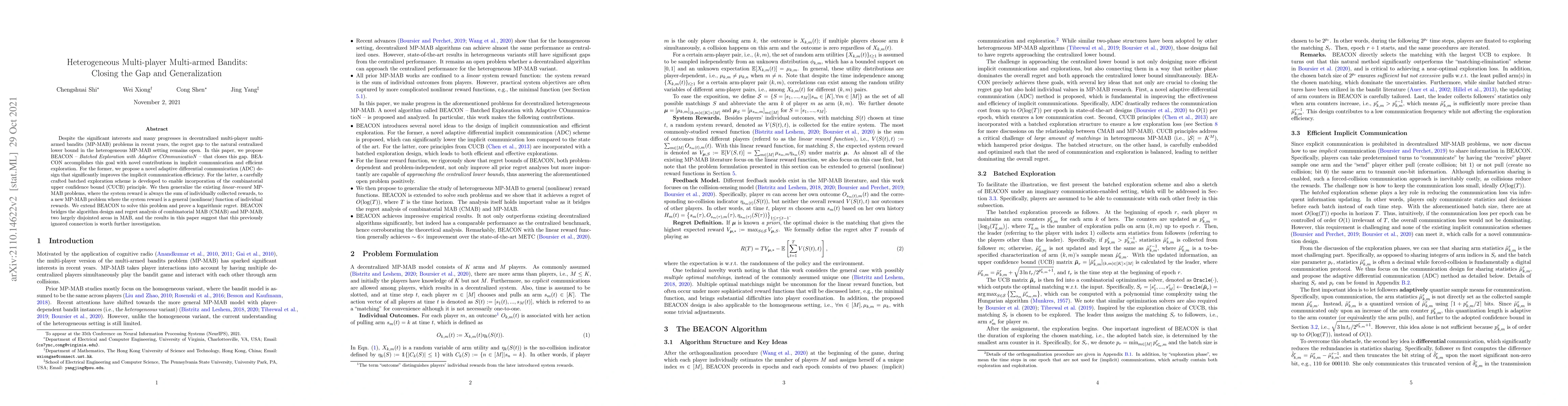 Despite the significant interests and many progresses in decentralized multi-player multi-armed bandits (MP-MAB) problems in recent years, the regret gap to the natural centralized lower bound in the heterogeneous MP-MAB setting remains open. In this paper, we propose BEACON -- Batched Exploration with Adaptive COmmunicatioN -- that closes this gap. BEACON accomplishes this goal with novel contributions in implicit communication and efficient exploration. For the former, we propose a novel adaptive differential communication (ADC) design that significantly improves the implicit communication efficiency. For the latter, a carefully crafted batched exploration scheme is developed to enable incorporation of the combinatorial upper confidence bound (CUCB) principle. We then generalize the existing linear-reward MP-MAB problems, where the system reward is always the sum of individually collected rewards, to a new MP-MAB problem where the system reward is a general (nonlinear) function of individual rewards. We extend BEACON to solve this problem and prove a logarithmic regret. BEACON bridges the algorithm design and regret analysis of combinatorial MAB (CMAB) and MP-MAB, two largely disjointed areas in MAB, and the results in this paper suggest that this previously ignored connection is worth further investigation.
