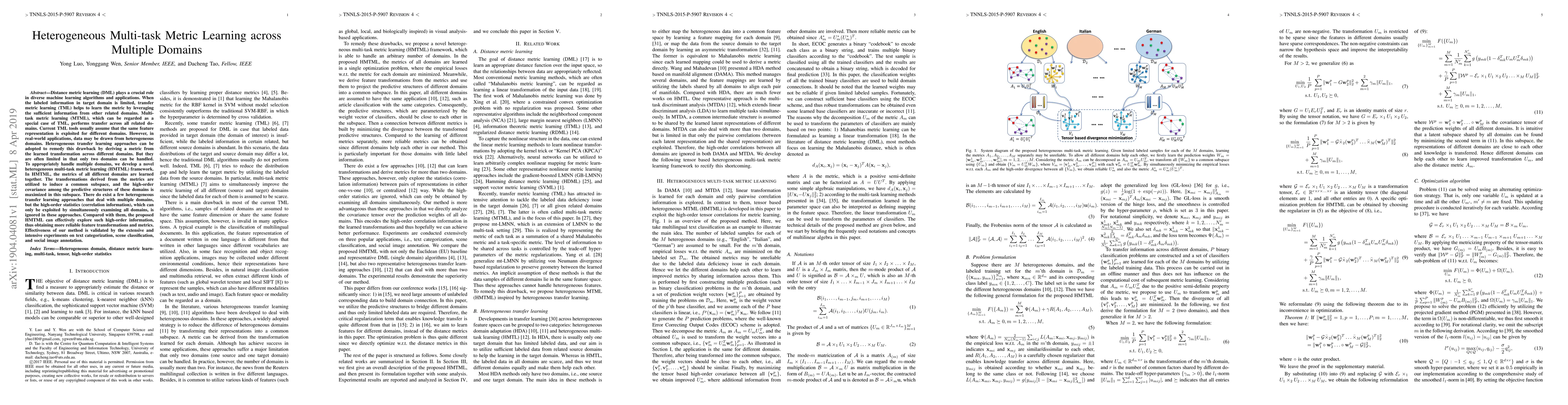 The paper proposes a novel Heterogeneous Multi-task Metric Learning (HMTML) framework to address the challenge of learning distance metrics across multiple heterogeneous domains. Unlike existing methods, HMTML maximizes high-order covariance among predictive structures in a common subspace, leveraging transformation metrics to derive more reliable feature transformations and metrics. Experimental results on text categorization, scene classification, and social image annotation demonstrate the effectiveness of the proposed approach.