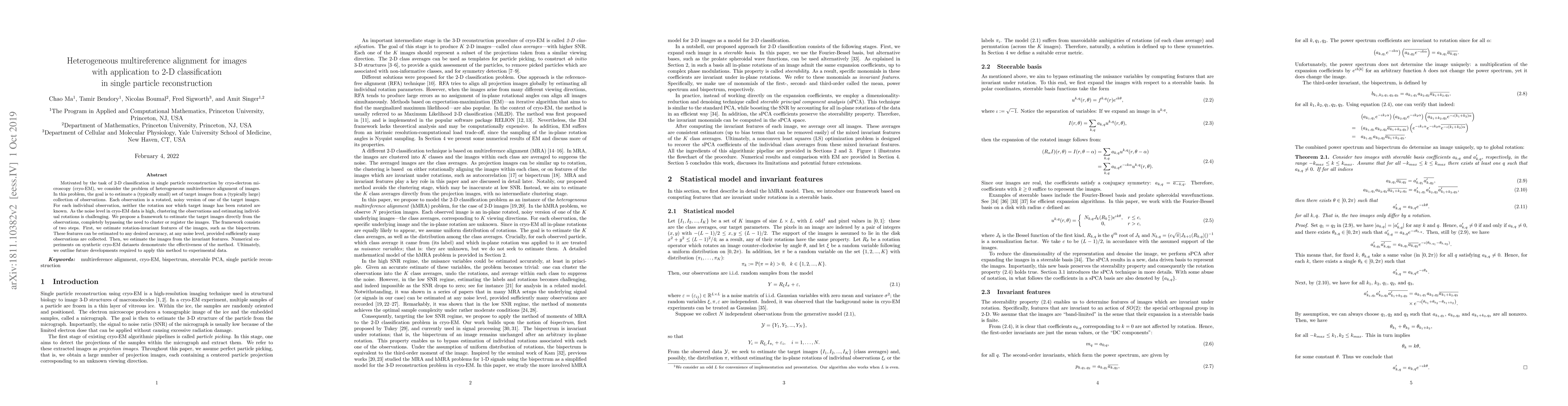 Motivated by the task of 2-D classification in single particle reconstruction by cryo-electron microscopy (cryo-EM), we consider the problem of heterogeneous multireference alignment of images. In this problem, the goal is to estimate a (typically small) set of target images from a (typically large) collection of observations. Each observation is a rotated, noisy version of one of the target images. For each individual observation, neither the rotation nor which target image has been rotated are known. As the noise level in cryo-EM data is high, clustering the observations and estimating individual rotations is challenging. We propose a framework to estimate the target images directly from the observations, completely bypassing the need to cluster or register the images. The framework consists of two steps. First, we estimate rotation-invariant features of the images, such as the bispectrum. These features can be estimated to any desired accuracy, at any noise level, provided sufficiently many observations are collected. Then, we estimate the images from the invariant features. Numerical experiments on synthetic cryo-EM datasets demonstrate the effectiveness of the method. Ultimately, we outline future developments required to apply this method to experimental data.