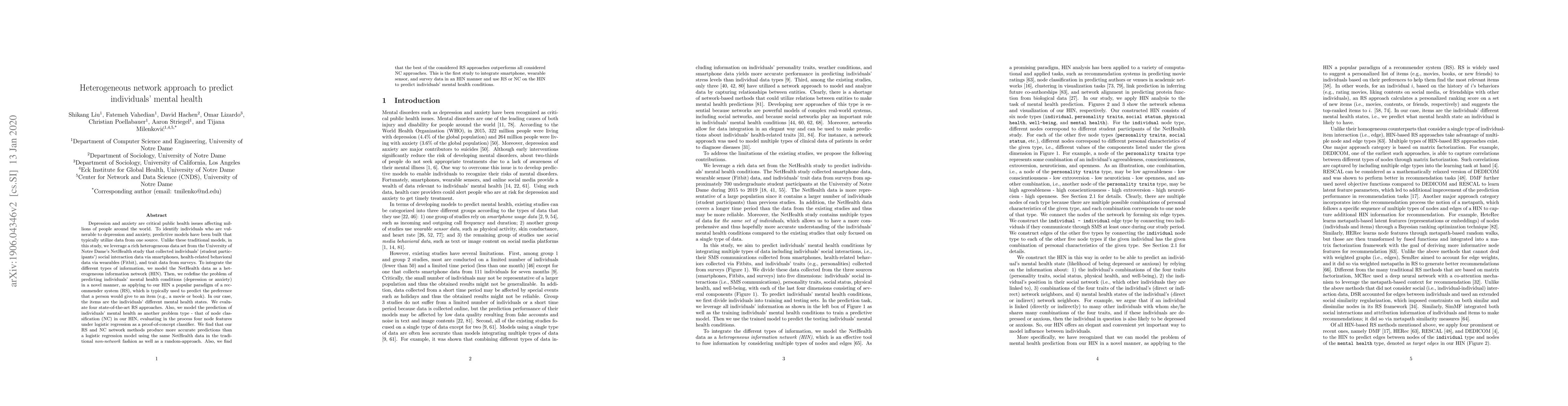 This study integrates diverse data sources from smartphones, wearables, and surveys into a heterogeneous information network to predict individuals' mental health conditions, employing recommender system and node classification methods. The results show that these network-based approaches outperform traditional logistic regression and random prediction methods.