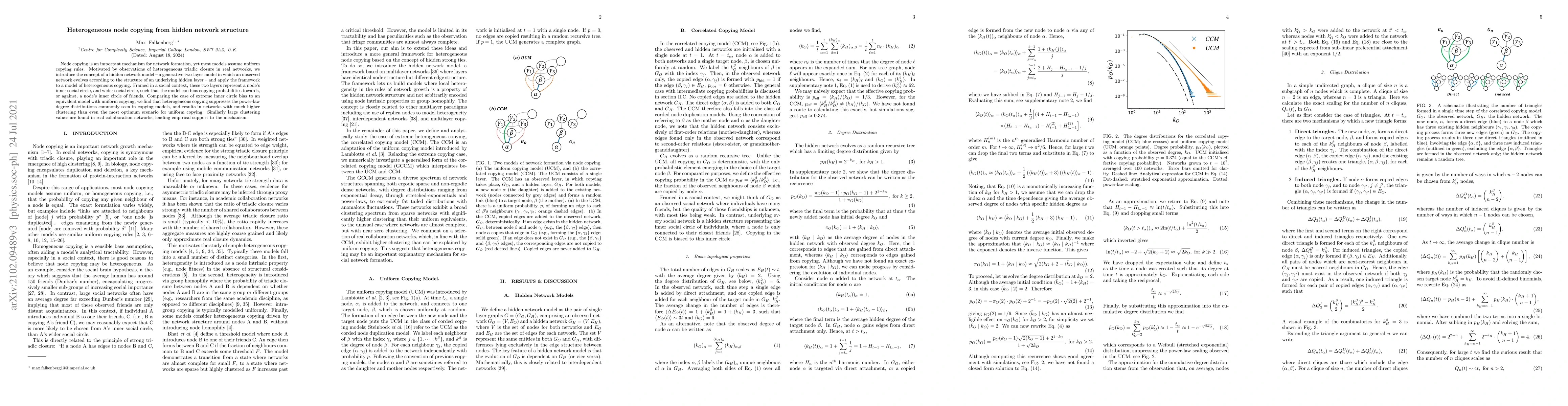 This paper introduces a hidden network model for node copying, where copying rules are heterogeneous based on an underlying hidden layer representing a node's inner and wider social circles. It finds that heterogeneous copying significantly alters network structure, suppressing power-law degree distributions and increasing clustering, which aligns with observed patterns in real collaboration networks.