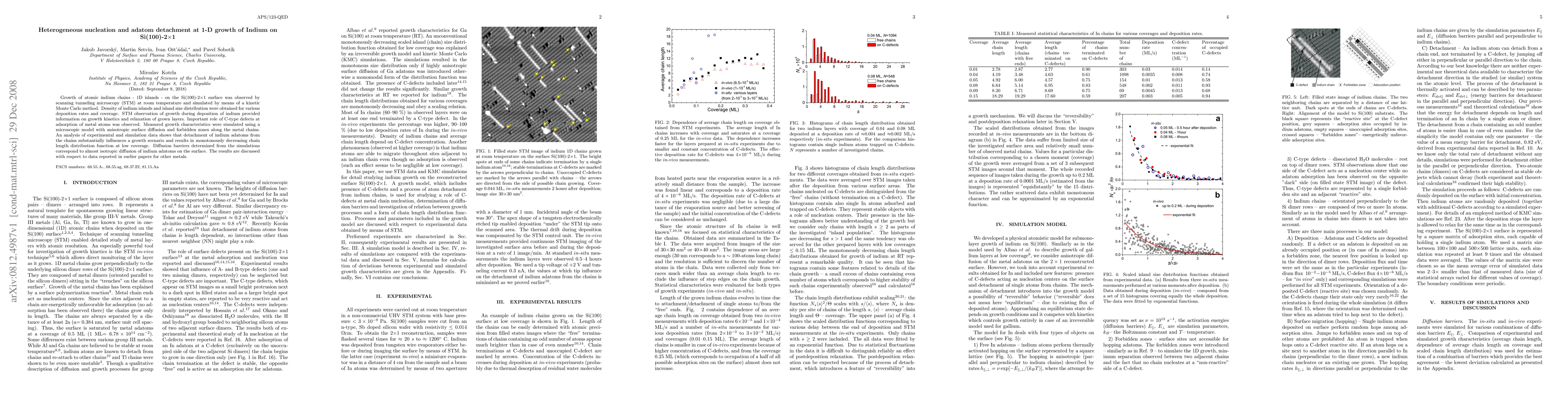Growth of atomic indium chains - 1D islands - on the Si(100)-2x1 surface was observed by scanning tunneling microscopy (STM) at room temperature and simulated by means of a kinetic Monte Carlo method. Density of indium islands and island size distribution were obtained for various deposition rates and coverage. STM observation of growth during deposition of indium provided information on growth kinetics and relaxation of grown layers. Important role of C-type defects at adsorption of metal atoms was observed. Measured growth characteristics were simulated using a microscopic model with anisotropic surface diffusion and forbidden zones along the metal chains. An analysis of experimental and simulation data shows that detachment of indium adatoms from the chains substantially influences a growth scenario and results in monotonously decreasing chain length distribution function at low coverage. Diffusion barriers determined from the simulations correspond to almost isotropic diffusion of indium adatoms on the surface. The results are discussed with respect to data reported in earlier papers for other metals.
