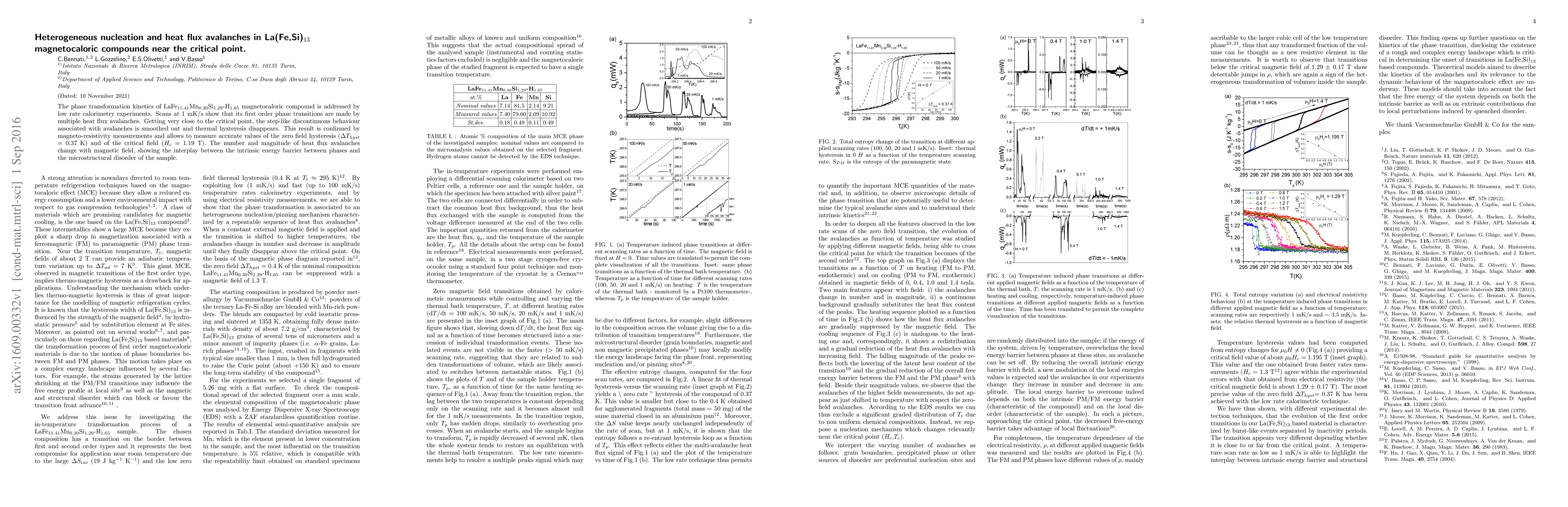 Researchers studied a magnetocaloric compound near its critical point, finding that heat flux avalanches occur during phase transitions, with the number and magnitude of these avalanches changing with magnetic field. The study provides insight into the interplay between intrinsic energy barriers and microstructural disorder in the material.
