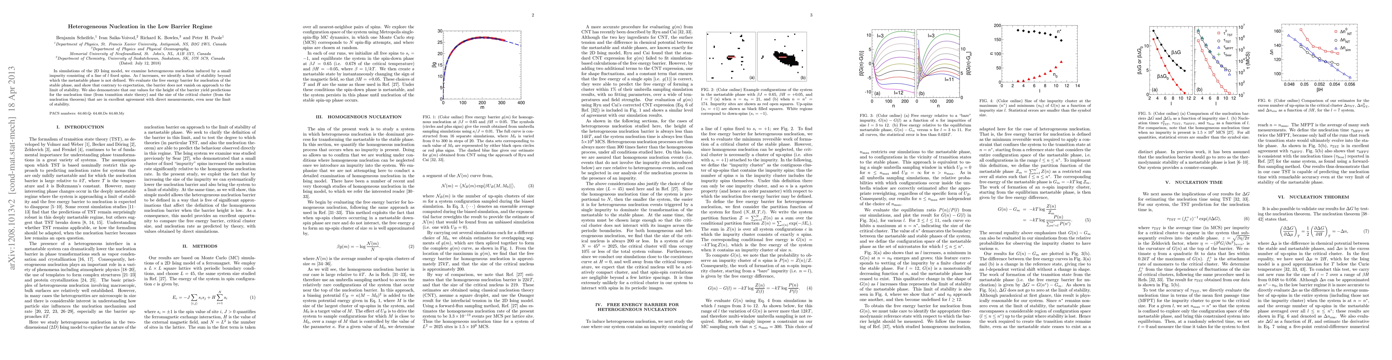 This paper investigates heterogeneous nucleation in the 2D Ising model induced by a small impurity, finding that the free energy barrier does not vanish as the impurity size approaches the limit of stability. The study shows excellent agreement between predicted nucleation time and critical cluster size and direct measurements.