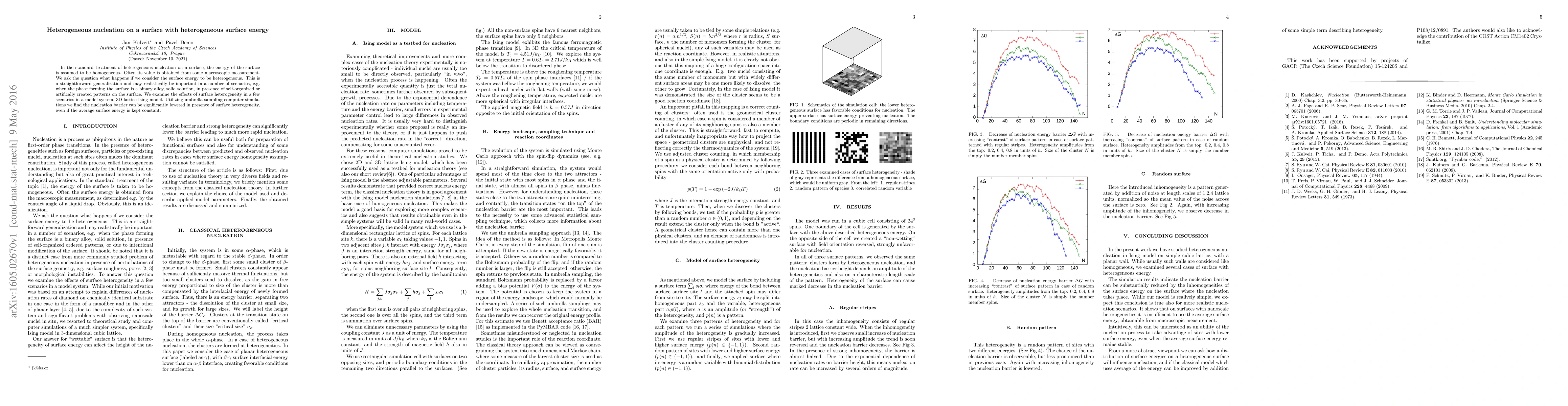 This paper explores the impact of heterogeneous surface energy on nucleation processes, using a 3D lattice Ising model and umbrella sampling simulations. It finds that surface heterogeneity can significantly lower the nucleation barrier, even when the average surface energy remains constant.