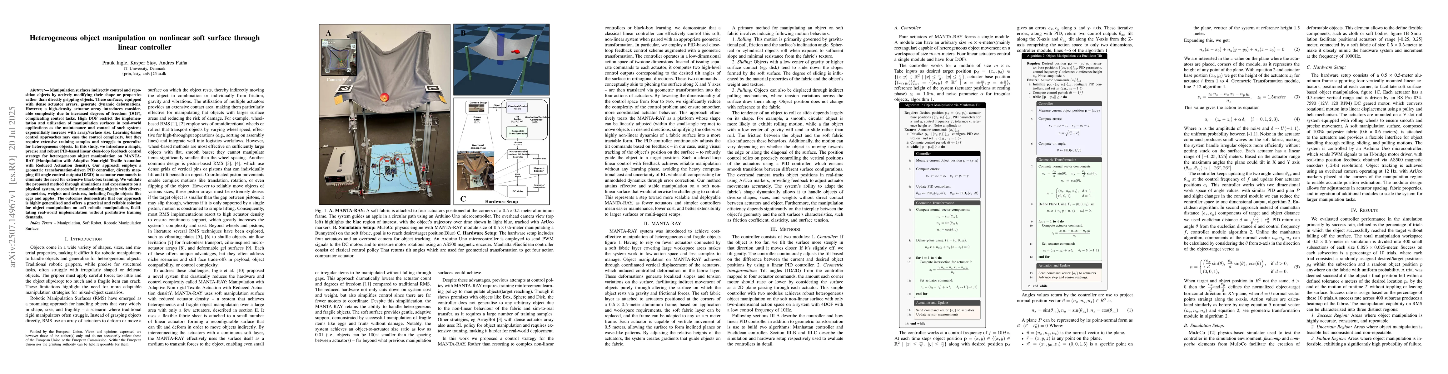 Manipulation surfaces indirectly control and reposition objects by actively modifying their shape or properties rather than directly gripping objects. These surfaces, equipped with dense actuator arrays, generate dynamic deformations. However, a high-density actuator array introduces considerable complexity due to increased degrees of freedom (DOF), complicating control tasks. High DOF restrict the implementation and utilization of manipulation surfaces in real-world applications as the maintenance and control of such systems exponentially increase with array/surface size. Learning-based control approaches may ease the control complexity, but they require extensive training samples and struggle to generalize for heterogeneous objects. In this study, we introduce a simple, precise and robust PID-based linear close-loop feedback control strategy for heterogeneous object manipulation on MANTA-RAY (Manipulation with Adaptive Non-rigid Textile Actuation with Reduced Actuation density). Our approach employs a geometric transformation-driven PID controller, directly mapping tilt angle control outputs(1D/2D) to actuator commands to eliminate the need for extensive black-box training. We validate the proposed method through simulations and experiments on a physical system, successfully manipulating objects with diverse geometries, weights and textures, including fragile objects like eggs and apples. The outcomes demonstrate that our approach is highly generalized and offers a practical and reliable solution for object manipulation on soft robotic manipulation, facilitating real-world implementation without prohibitive training demands.