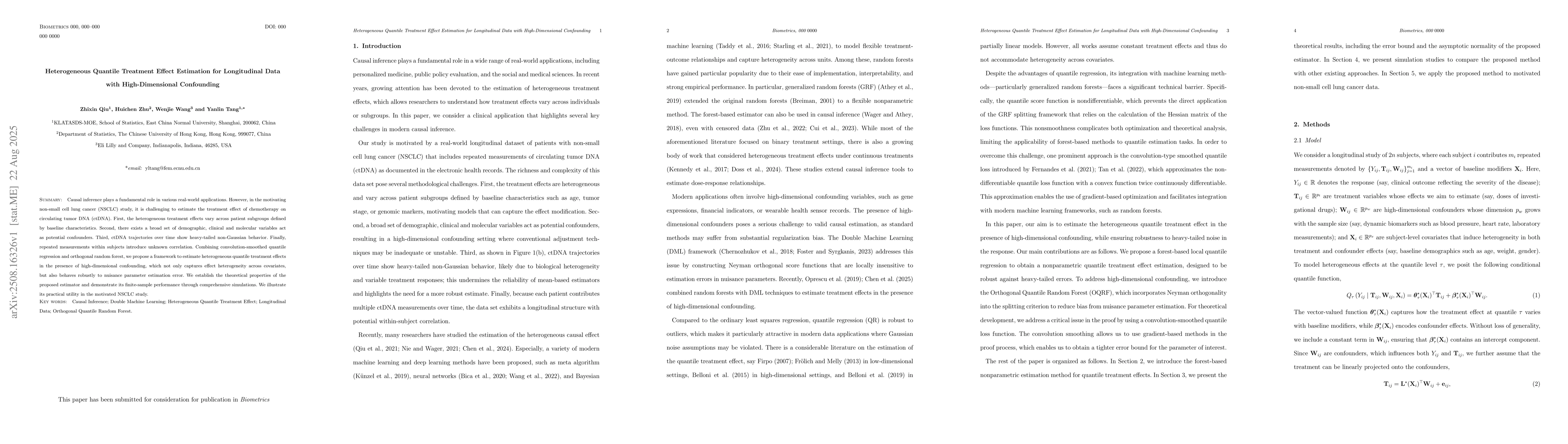 Causal inference plays a fundamental role in various real-world applications. However, in the motivating non-small cell lung cancer (NSCLC) study, it is challenging to estimate the treatment effect of chemotherapy on circulating tumor DNA (ctDNA). First, the heterogeneous treatment effects vary across patient subgroups defined by baseline characteristics. Second, there exists a broad set of demographic, clinical and molecular variables act as potential confounders. Third, ctDNA trajectories over time show heavy-tailed non-Gaussian behavior. Finally, repeated measurements within subjects introduce unknown correlation. Combining convolution-smoothed quantile regression and orthogonal random forest, we propose a framework to estimate heterogeneous quantile treatment effects in the presence of high-dimensional confounding, which not only captures effect heterogeneity across covariates, but also behaves robustly to nuisance parameter estimation error. We establish the theoretical properties of the proposed estimator and demonstrate its finite-sample performance through comprehensive simulations. We illustrate its practical utility in the motivated NSCLC study.
