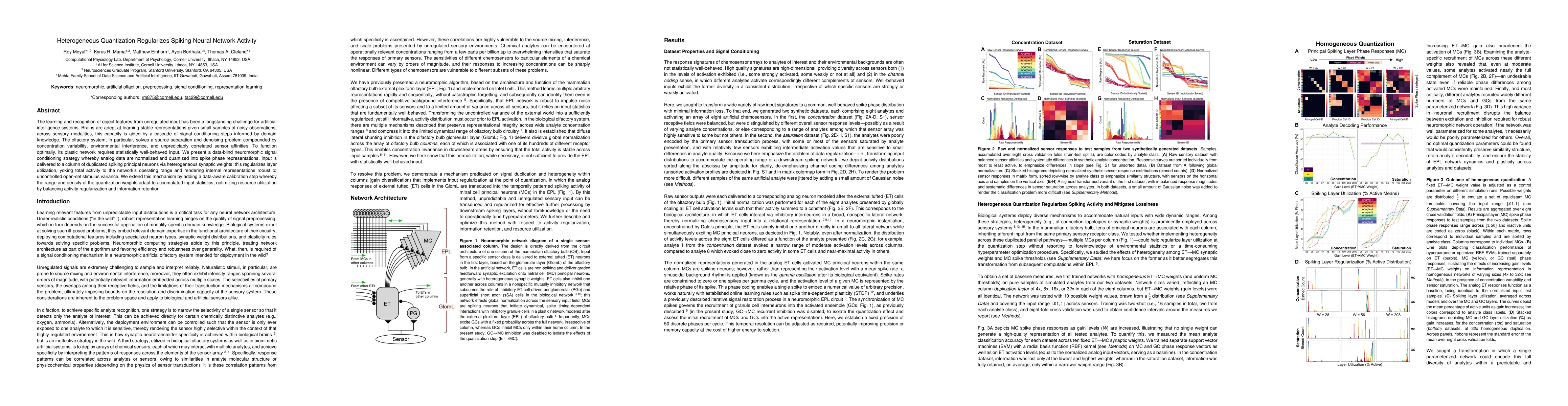 The learning and recognition of object features from unregulated input has been a longstanding challenge for artificial intelligence systems. Brains are adept at learning stable representations given small samples of noisy observations; across sensory modalities, this capacity is aided by a cascade of signal conditioning steps informed by domain knowledge. The olfactory system, in particular, solves a source separation and denoising problem compounded by concentration variability, environmental interference, and unpredictably correlated sensor affinities. To function optimally, its plastic network requires statistically well-behaved input. We present a data-blind neuromorphic signal conditioning strategy whereby analog data are normalized and quantized into spike phase representations. Input is delivered to a column of duplicated spiking principal neurons via heterogeneous synaptic weights; this regularizes layer utilization, yoking total activity to the network's operating range and rendering internal representations robust to uncontrolled open-set stimulus variance. We extend this mechanism by adding a data-aware calibration step whereby the range and density of the quantization weights adapt to accumulated input statistics, optimizing resource utilization by balancing activity regularization and information retention.