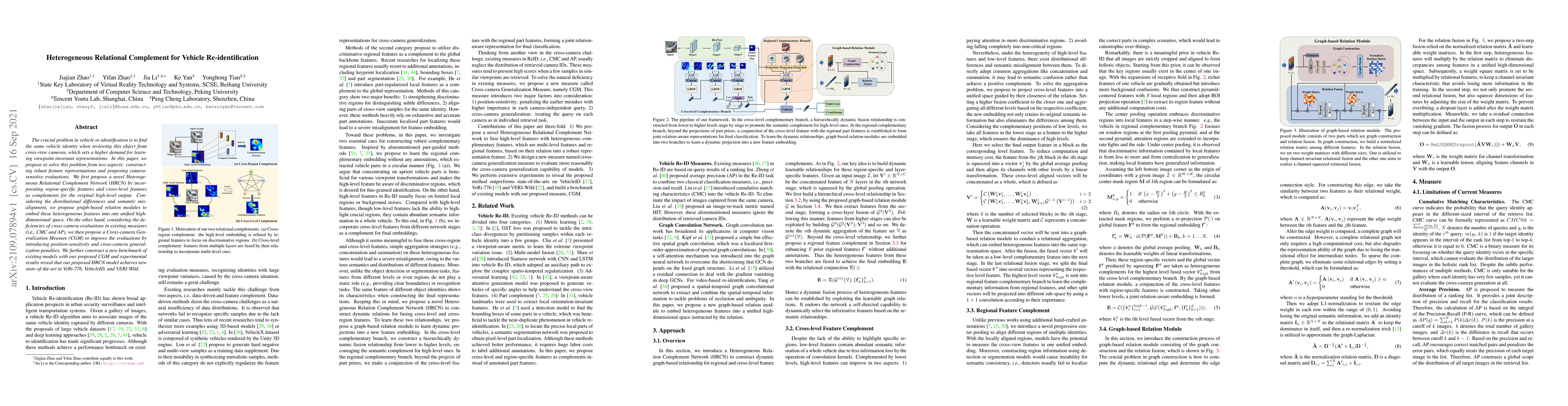 The crucial problem in vehicle re-identification is to find the same vehicle identity when reviewing this object from cross-view cameras, which sets a higher demand for learning viewpoint-invariant representations. In this paper, we propose to solve this problem from two aspects: constructing robust feature representations and proposing camera-sensitive evaluations. We first propose a novel Heterogeneous Relational Complement Network (HRCN) by incorporating region-specific features and cross-level features as complements for the original high-level output. Considering the distributional differences and semantic misalignment, we propose graph-based relation modules to embed these heterogeneous features into one unified high-dimensional space. On the other hand, considering the deficiencies of cross-camera evaluations in existing measures (i.e., CMC and AP), we then propose a Cross-camera Generalization Measure (CGM) to improve the evaluations by introducing position-sensitivity and cross-camera generalization penalties. We further construct a new benchmark of existing models with our proposed CGM and experimental results reveal that our proposed HRCN model achieves new state-of-the-art in VeRi-776, VehicleID, and VERI-Wild.