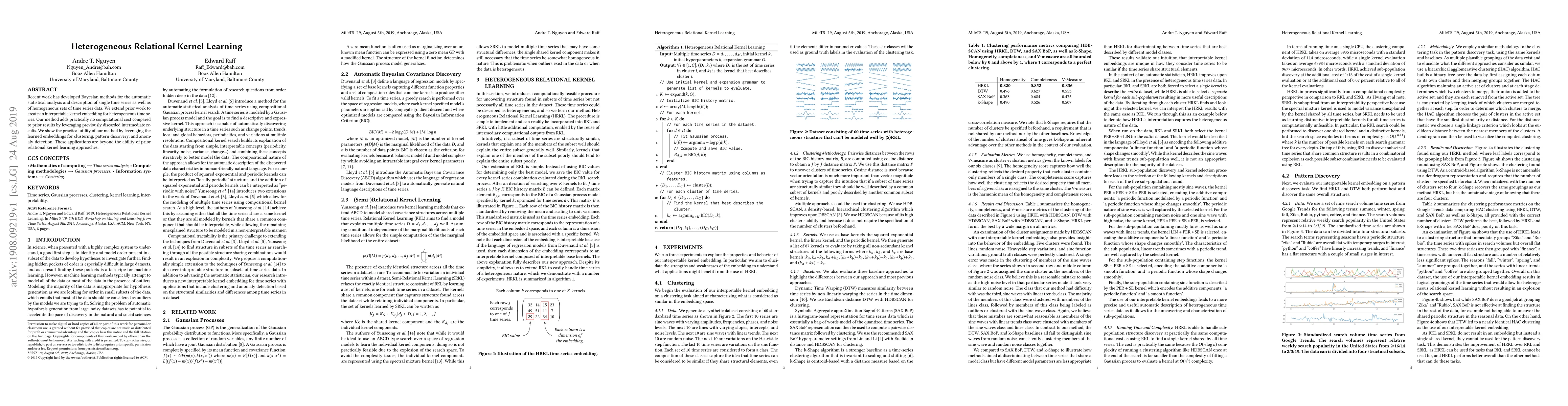 Recent work has developed Bayesian methods for the automatic statistical analysis and description of single time series as well as of homogeneous sets of time series data. We extend prior work to create an interpretable kernel embedding for heterogeneous time series. Our method adds practically no computational cost compared to prior results by leveraging previously discarded intermediate results. We show the practical utility of our method by leveraging the learned embeddings for clustering, pattern discovery, and anomaly detection. These applications are beyond the ability of prior relational kernel learning approaches.