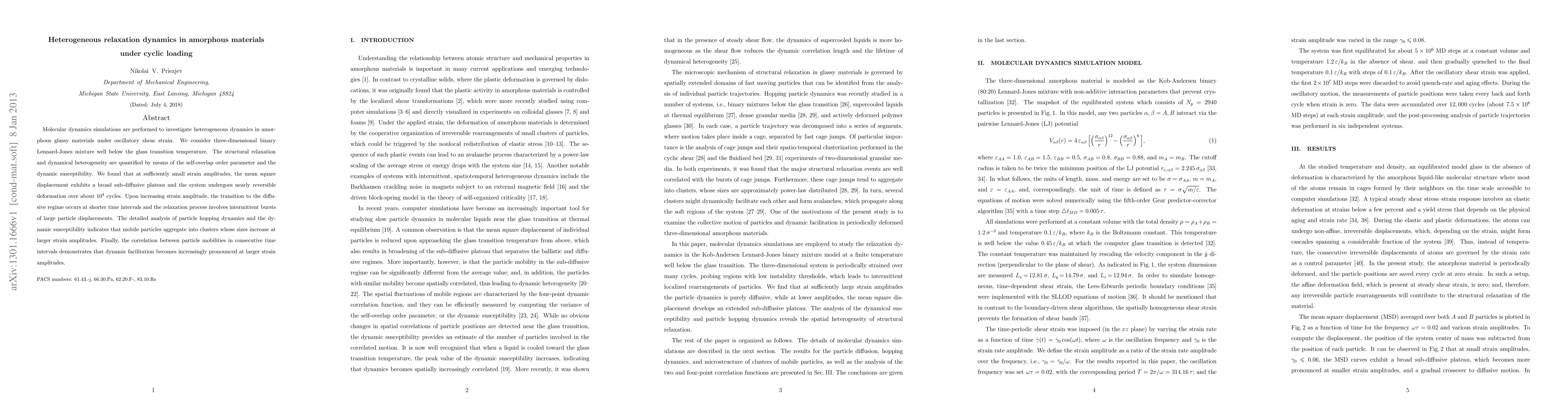 This paper uses molecular dynamics simulations to study the heterogeneous relaxation dynamics in amorphous glassy materials under cyclic loading, revealing a transition from sub-diffusive to diffusive behavior with increasing strain amplitude, characterized by particle clustering and enhanced dynamic facilitation.