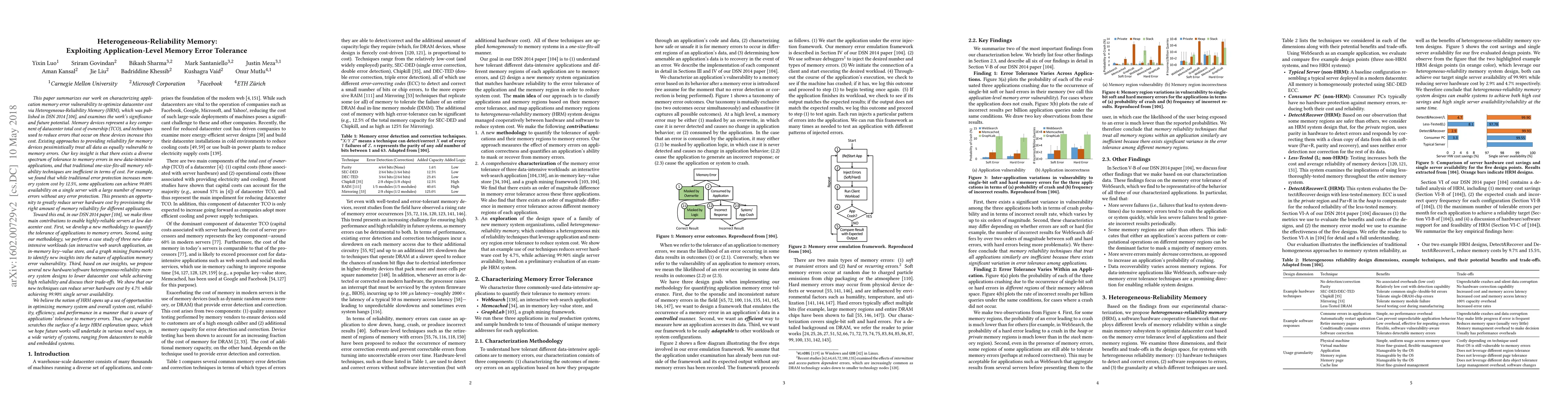 This paper introduces Heterogeneous-Reliability Memory (HRM) to optimize datacenter cost by provisioning the right amount of memory reliability for different applications, reducing server hardware cost by 4.7% while achieving high reliability.