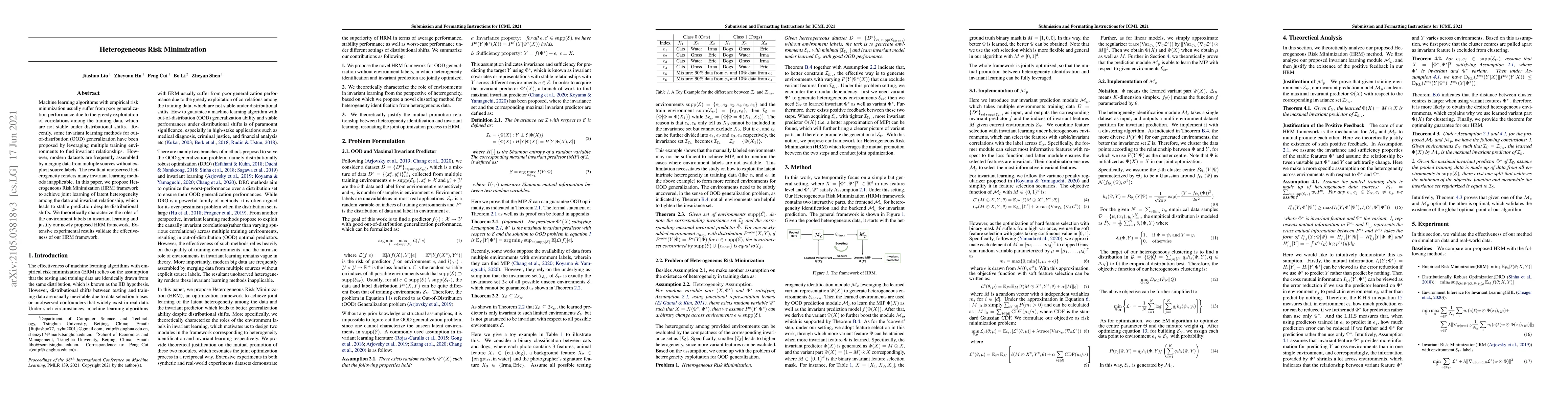 This paper proposes the Heterogeneous Risk Minimization (HRM) framework to address poor generalization in machine learning due to distributional shifts. It aims to jointly learn latent data heterogeneity and invariant relationships, achieving stable predictions despite shifts, and is validated through experimental results.