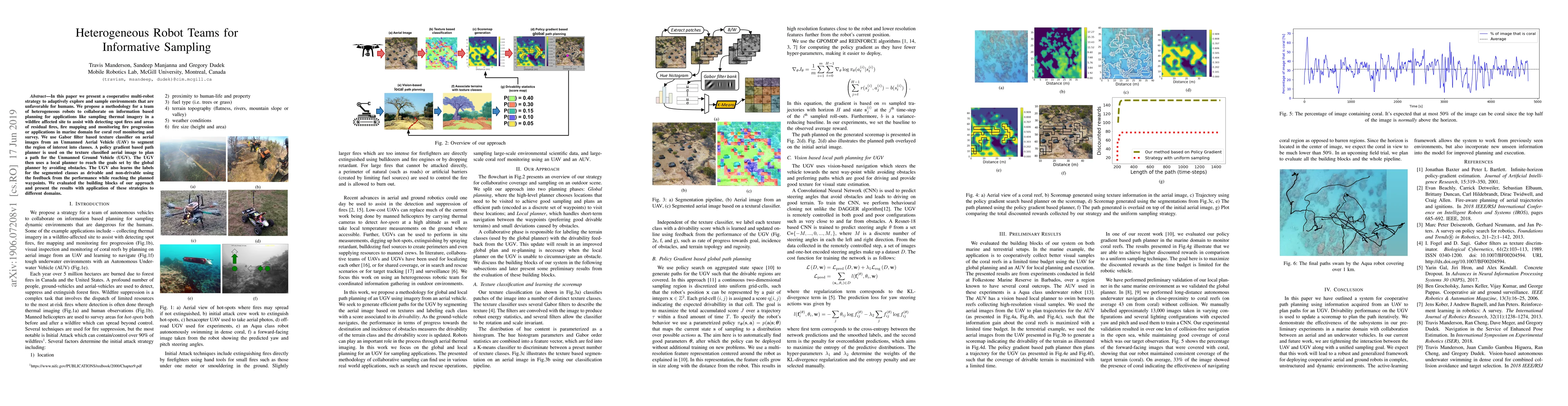 In this paper we present a cooperative multi-robot strategy to adaptively explore and sample environments that are unfavorable for humans. We propose a methodology for a team of heterogeneous robots to collaborate on information based planning for applications like sampling thermal imagery in a wildfire affected site to assist with detecting spot fires and areas of residual fires, fire mapping and monitoring fire progression or applications in marine domain for coral reef monitoring and survey. We use Gabor filter based texture classifier on aerial images from an Unmanned Aerial Vehicle (UAV) to segment the region of interest into classes. A policy gradient based path planner is used on the texture classified aerial image to plan a path for the Unmanned Ground Vehicle (UGV). The UGV then uses a local planner to reach the goals set by the global planner by avoiding obstacles. The UGV also learns the labels for the segmented classes as drivable and non-drivable using the feedback from the performance while reaching the planned waypoints. We evaluated the building blocks of our approach and present the results with application of these strategies to different domains.