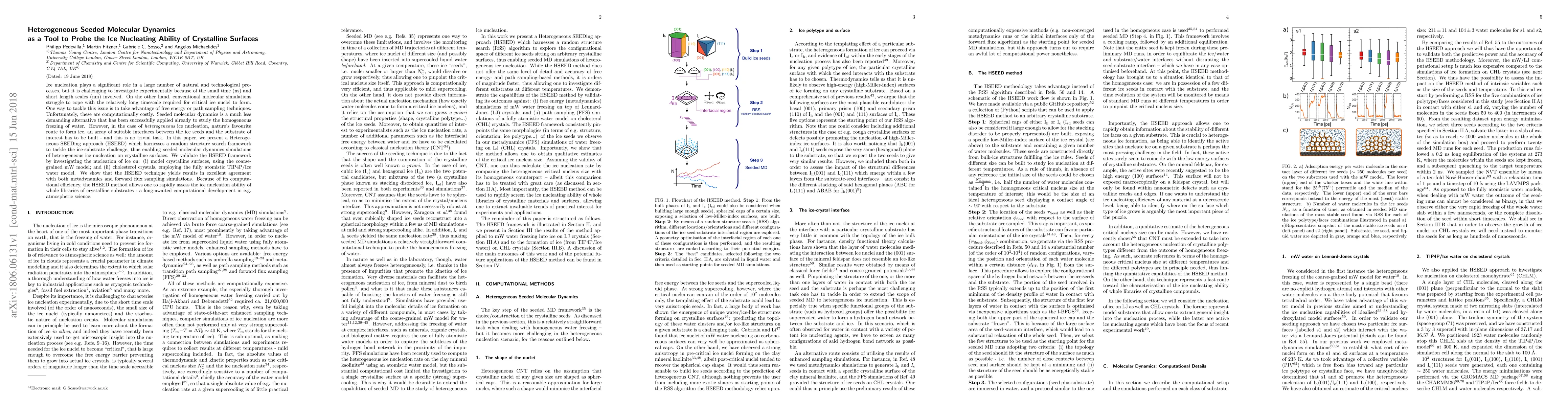 This paper introduces a Heterogeneous SEEDing (HSEED) approach for efficient molecular dynamics simulations to study ice nucleation on crystalline surfaces. The HSEED framework, validated against metadynamics and forward flux sampling, enables rapid assessment of ice-nucleating abilities of various substrates, offering significant computational benefits for atmospheric science applications.