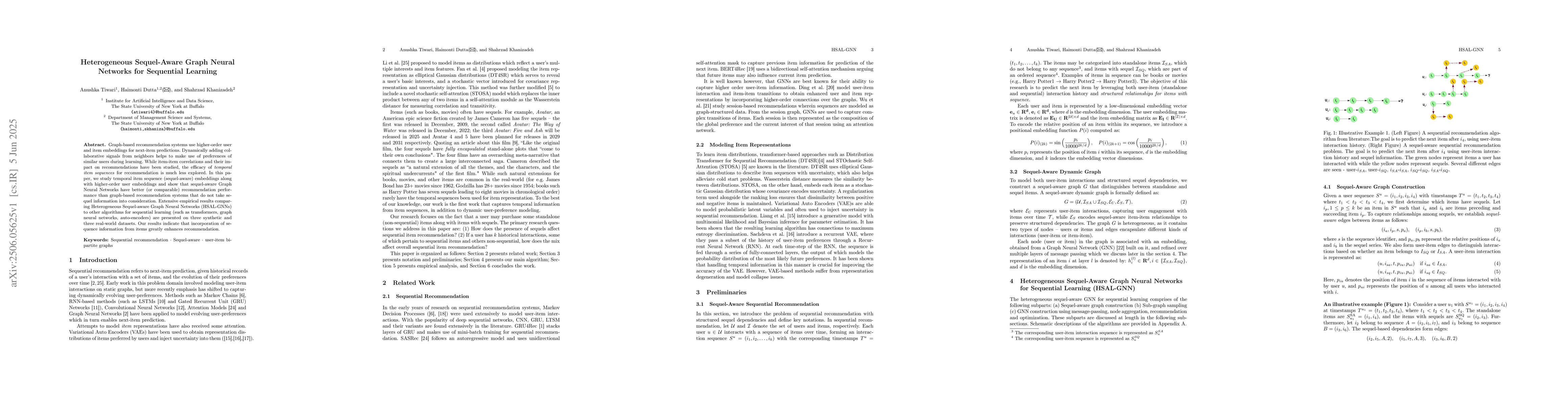 This paper introduces Heterogeneous Sequel-Aware Graph Neural Networks for sequential learning, which improve recommendation performance by incorporating sequence information from items. It outperforms other algorithms on synthetic and real-world datasets.