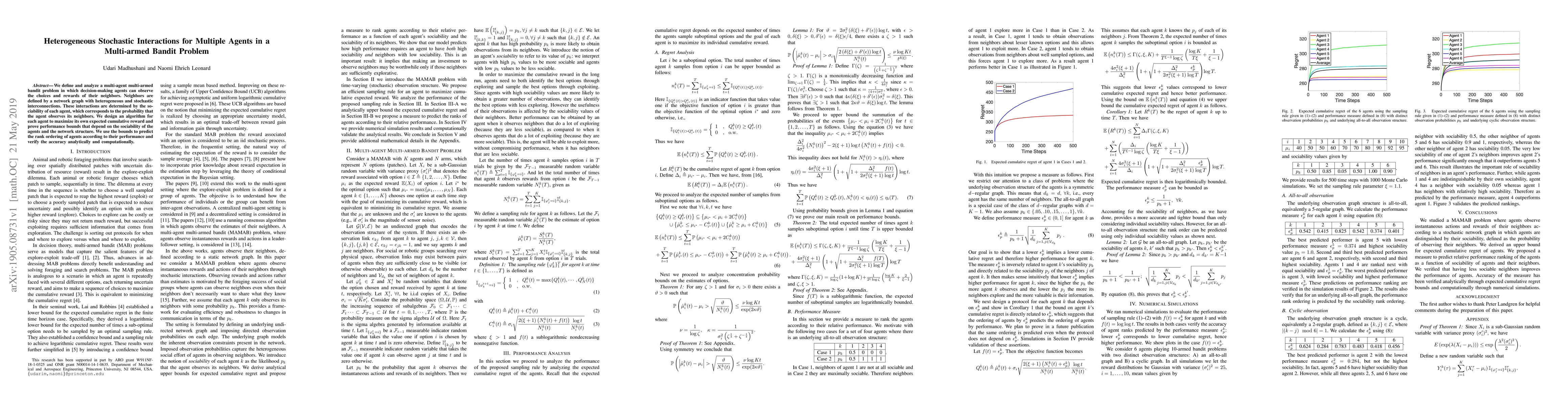 We define and analyze a multi-agent multi-armed bandit problem in which decision-making agents can observe the choices and rewards of their neighbors. Neighbors are defined by a network graph with heterogeneous and stochastic interconnections. These interactions are determined by the sociability of each agent, which corresponds to the probability that the agent observes its neighbors. We design an algorithm for each agent to maximize its own expected cumulative reward and prove performance bounds that depend on the sociability of the agents and the network structure. We use the bounds to predict the rank ordering of agents according to their performance and verify the accuracy analytically and computationally.