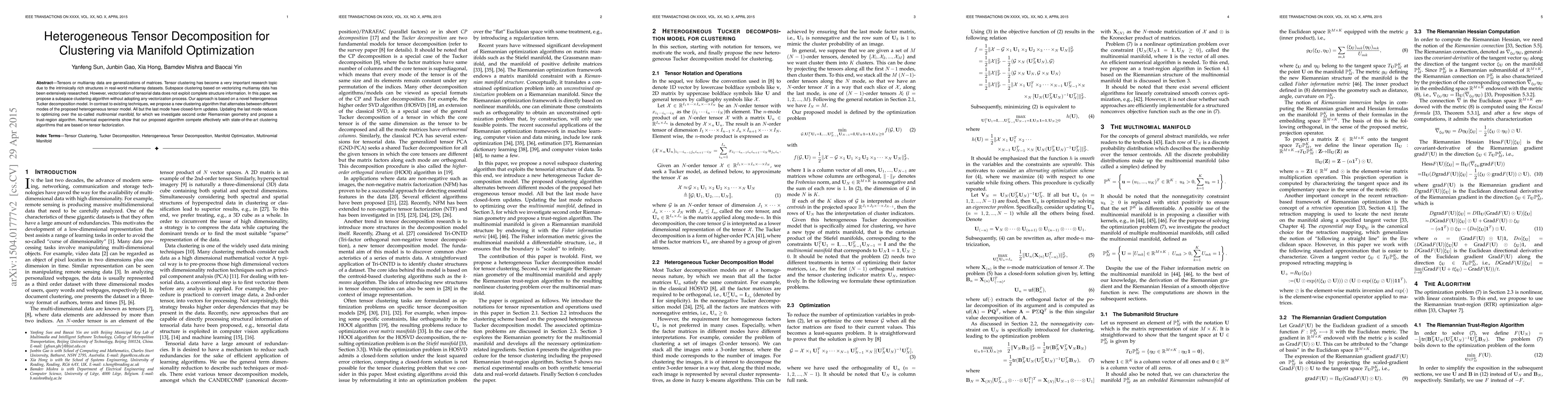 Tensors or multiarray data are generalizations of matrices. Tensor clustering has become a very important research topic due to the intrinsically rich structures in real-world multiarray datasets. Subspace clustering based on vectorizing multiarray data has been extensively researched. However, vectorization of tensorial data does not exploit complete structure information. In this paper, we propose a subspace clustering algorithm without adopting any vectorization process. Our approach is based on a novel heterogeneous Tucker decomposition model. In contrast to existing techniques, we propose a new clustering algorithm that alternates between different modes of the proposed heterogeneous tensor model. All but the last mode have closed-form updates. Updating the last mode reduces to optimizing over the so-called multinomial manifold, for which we investigate second order Riemannian geometry and propose a trust-region algorithm. Numerical experiments show that our proposed algorithm compete effectively with state-of-the-art clustering algorithms that are based on tensor factorization.