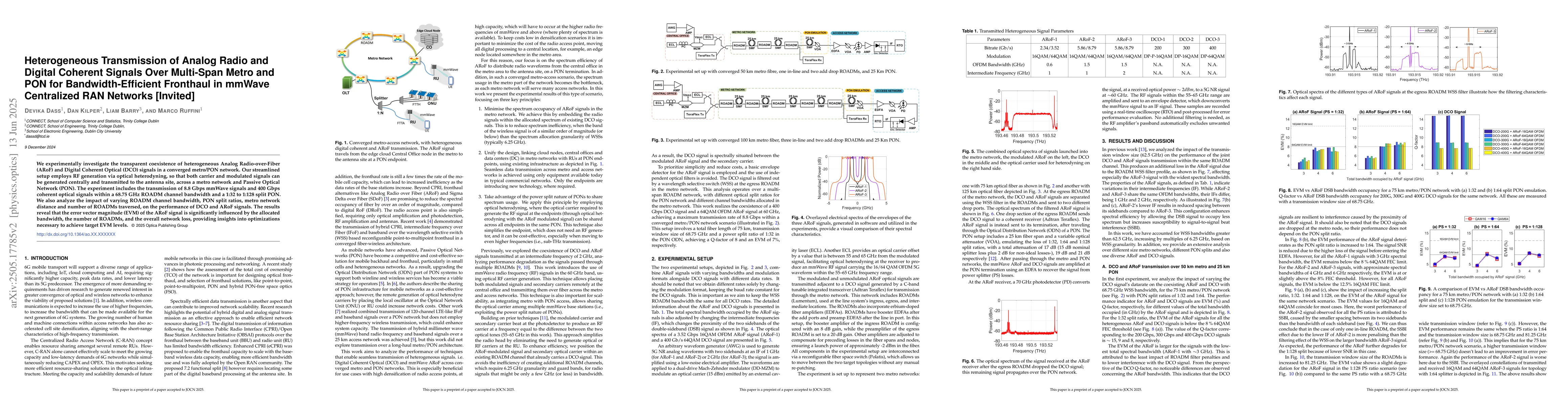 Demonstrates transparent coexistence of ARoF and DCO signals in a converged metro/PON network, providing a potential solution for bandwidth-efficient fronthaul in mmWave centralized RAN networks.