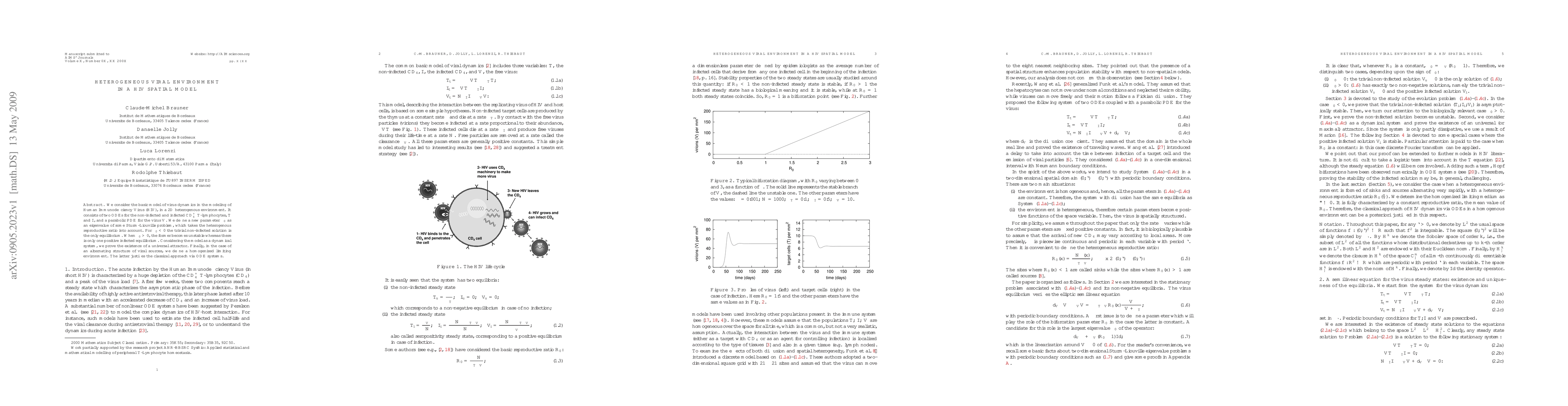 We consider the basic model of virus dynamics in the modeling of Human Immunodeficiency Virus (HIV), in a 2D heterogenous environment. It consists of two ODEs for the non-infected and infected $CD_4^+$ $T$ lymphocytes, $T$ and $I$, and a parabolic PDE for the virus $V$. We define a new parameter $\lambda_0$ as an eigenvalue of some Sturm-Liouville problem, which takes the heterogenous reproductive ratio into account. For $\lambda_0<0$ the trivial non-infected solution is the only equilibrium. When $\lambda_0>0$, the former becomes unstable whereas there is only one positive infected equilibrium. Considering the model as a dynamical system, we prove the existence of a universal attractor. Finally, in the case of an alternating structure of viral sources, we define a homogenized limiting environment. The latter justifies the classical approach via ODE systems.