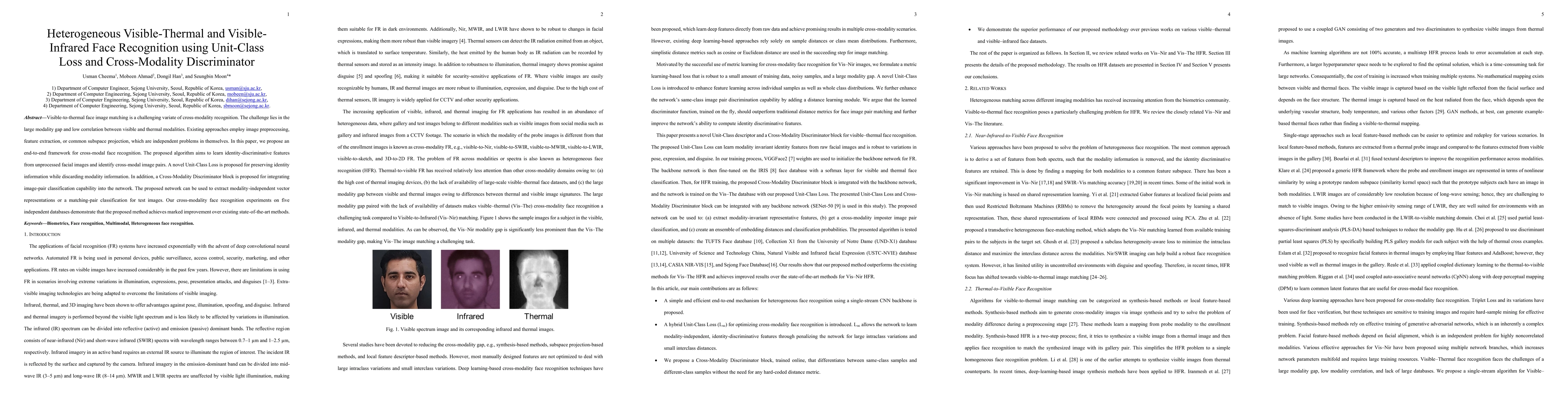 This paper proposes an end-to-end framework for cross-modal face recognition using visible and thermal images, introducing a Unit-Class Loss to preserve identity and a Cross-Modality Discriminator for classification, achieving superior performance over existing methods.