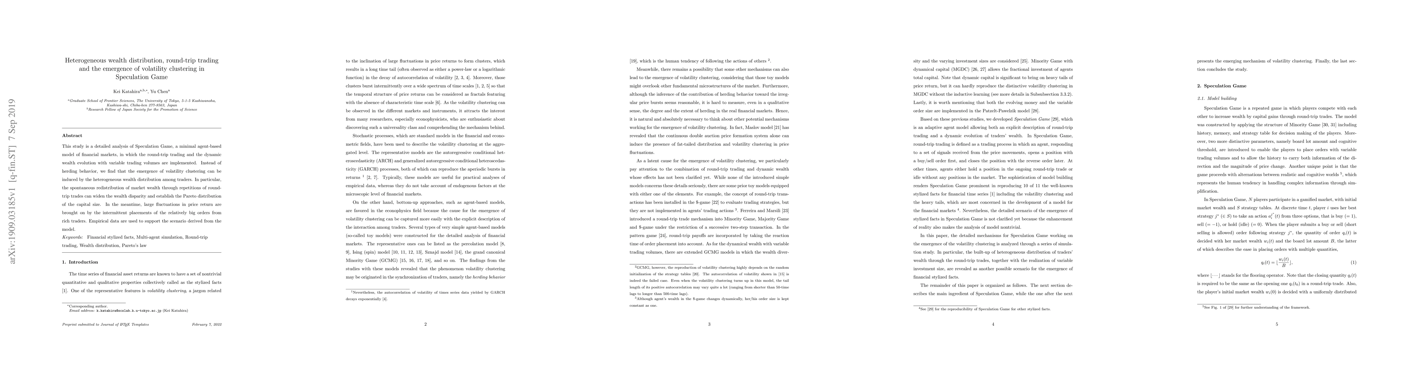 This study analyzes a Speculation Game model to show that volatility clustering arises from heterogeneous wealth distribution, not herding behavior. The model reveals that round-trip trades lead to wealth disparity and large price fluctuations due to large orders from wealthy traders, supported by empirical data.
