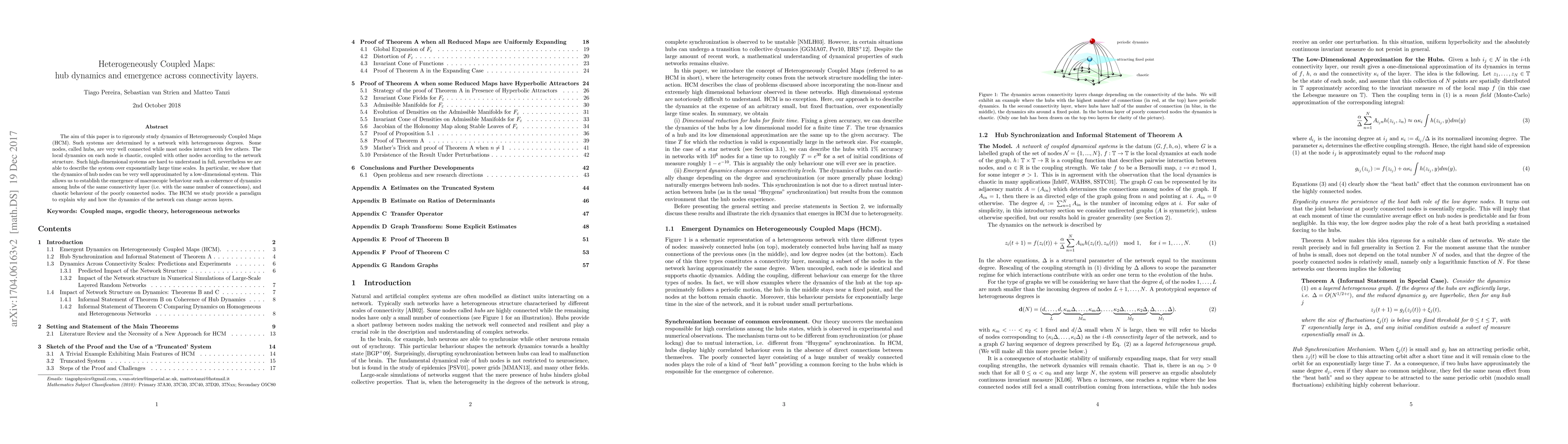 The aim of this paper is to rigorously study dynamics of Heterogeneously Coupled Maps (HCM). Such systems are determined by a network with heterogeneous degrees. Some nodes, called hubs, are very well connected while most nodes interact with few others. The local dynamics on each node is chaotic, coupled with other nodes according to the network structure. Such high-dimensional systems are hard to understand in full, nevertheless we are able to describe the system over exponentially large time scales. In particular, we show that the dynamics of hub nodes can be very well approximated by a low-dimensional system. This allows us to establish the emergence of macroscopic behaviour such as coherence of dynamics among hubs of the same connectivity layer (i.e. with the same number of connections), and chaotic behaviour of the poorly connected nodes. The HCM we study provide a paradigm to explain why and how the dynamics of the network can change across layers.