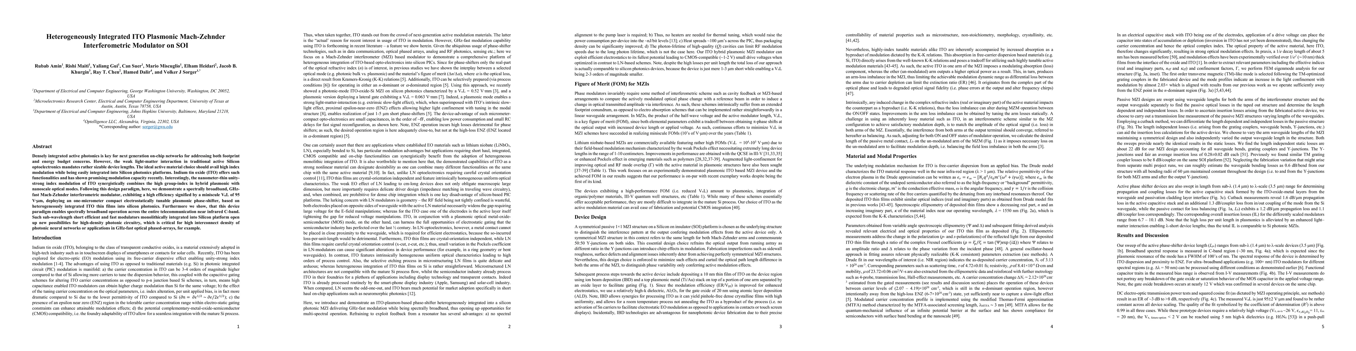 This paper presents a heterogenously integrated ITO plasmonic Mach-Zehnder interferometric modulator on SOI, demonstrating spectrally broadband, GHz-fast modulation with a small VpL of 95 Vum, offering significant potential for high-density photonic circuitry. The compact electrostatically tunable plasmonic phase-shifter enables efficient and fast operation across the C-band.