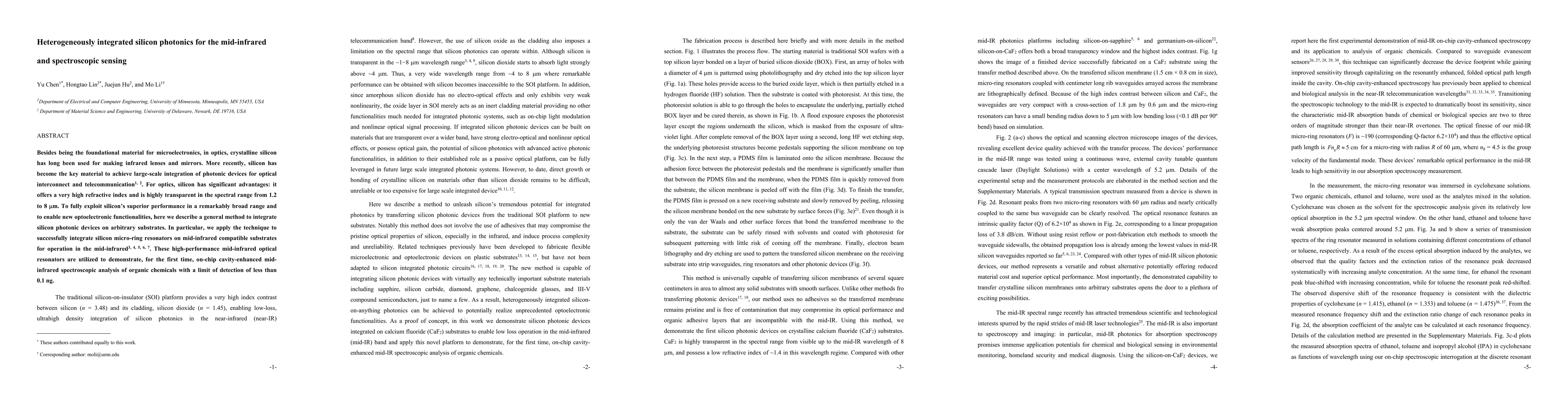 This paper presents a method for integrating silicon photonic devices on various substrates, enabling mid-infrared spectroscopic sensing. The technique successfully integrates silicon micro-ring resonators for mid-infrared applications, achieving on-chip cavity-enhanced detection of organic chemicals at a limit of 0.1 ng.