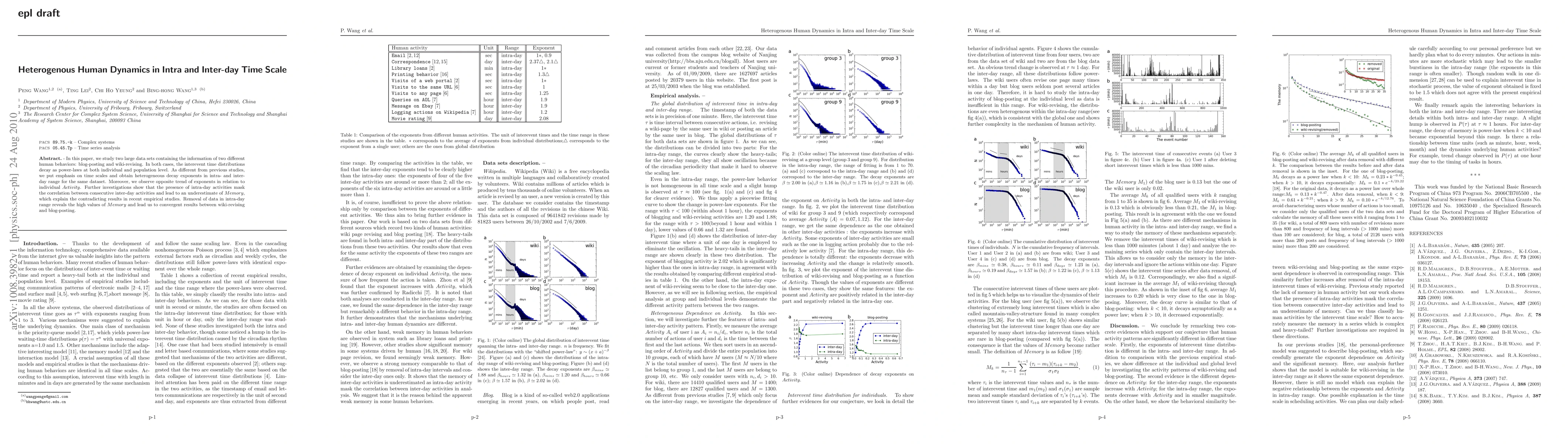 In this paper, we study two large data sets containing the information of two different human behaviors: blog-posting and wiki-revising. In both cases, the interevent time distributions decay as power-laws at both individual and population level. As different from previous studies, we put emphasis on time scales and obtain heterogeneous decay exponents in intra- and inter-day range for the same dataset. Moreover, we observe opposite trend of exponents in relation to individual $Activity$. Further investigations show that the presence of intra-day activities mask the correlation between consecutive inter-day activities and lead to an underestimate of $Memory$, which explain the contradicting results in recent empirical studies. Removal of data in intra-day range reveals the high values of $Memory$ and lead us to convergent results between wiki-revising and blog-posting.
