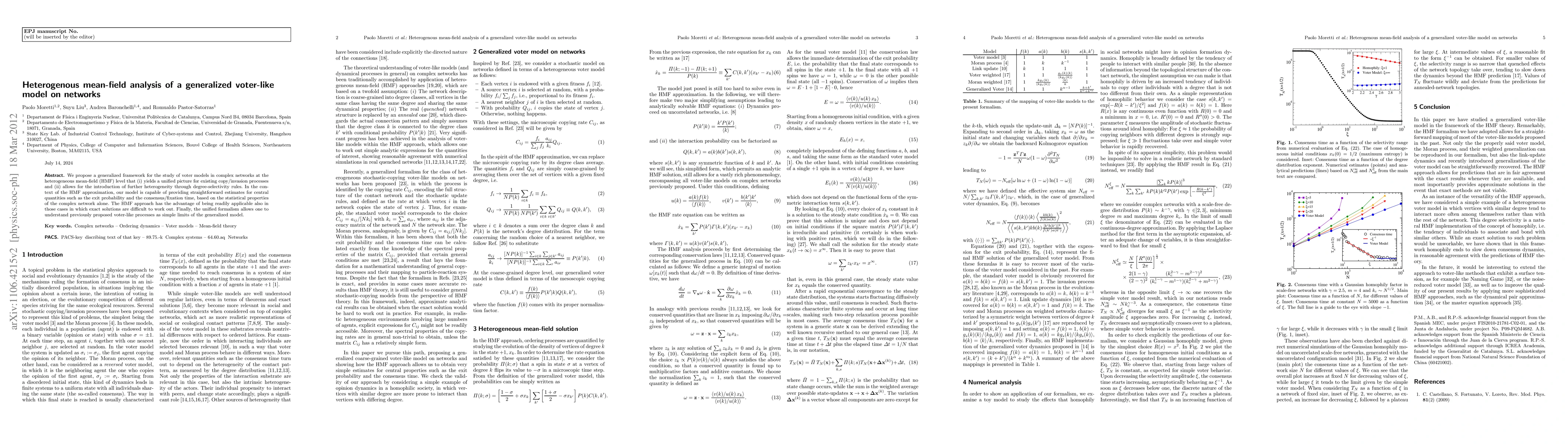 This paper proposes a generalized voter model framework for complex networks, utilizing a heterogeneous mean-field approach to provide estimates for exit probability and consensus time. The model unifies existing copy/invasion processes and introduces degree-selectivity for further heterogeneity.