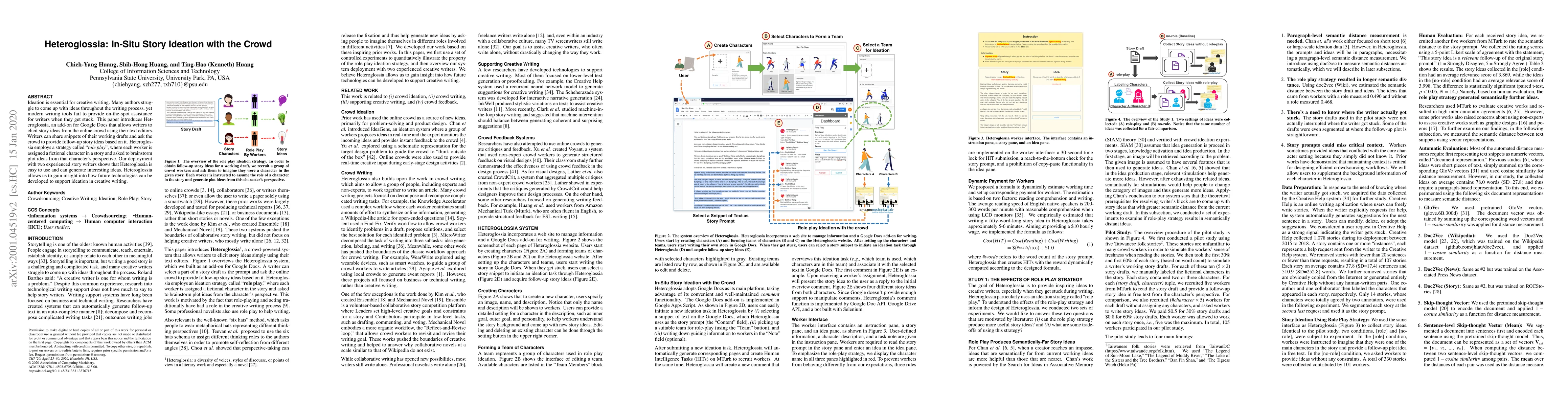 This paper introduces Heteroglossia, a Google Docs add-on that leverages crowdsourced input to assist writers in generating story ideas. By employing a "role play" strategy, it assigns fictional characters to crowd workers to brainstorm plot ideas, demonstrating ease of use and potential for future ideation support tools.
