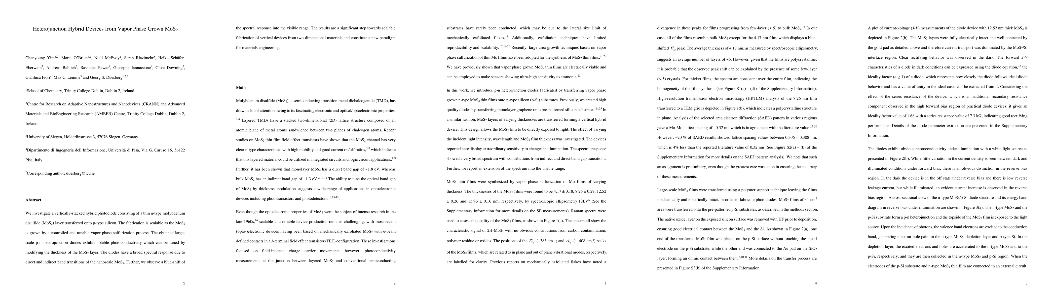 We investigate a vertically-stacked hybrid photodiode consisting of a thin n-type molybdenum disulfide (MoS$_{2}$) layer transferred onto p-type silicon. The fabrication is scalable as the MoS$_{2}$ is grown by a controlled and tunable vapor phase sulfurization process. The obtained large-scale p-n heterojunction diodes exhibit notable photoconductivity which can be tuned by modifying the thickness of the MoS$_{2}$ layer. The diodes have a broad spectral response due to direct and indirect band transitions of the nanoscale MoS$_{2}$. Further, we observe a blue-shift of the spectral response into the visible range. The results are a significant step towards scalable fabrication of vertical devices from two-dimensional materials and constitute a new paradigm for materials engineering.