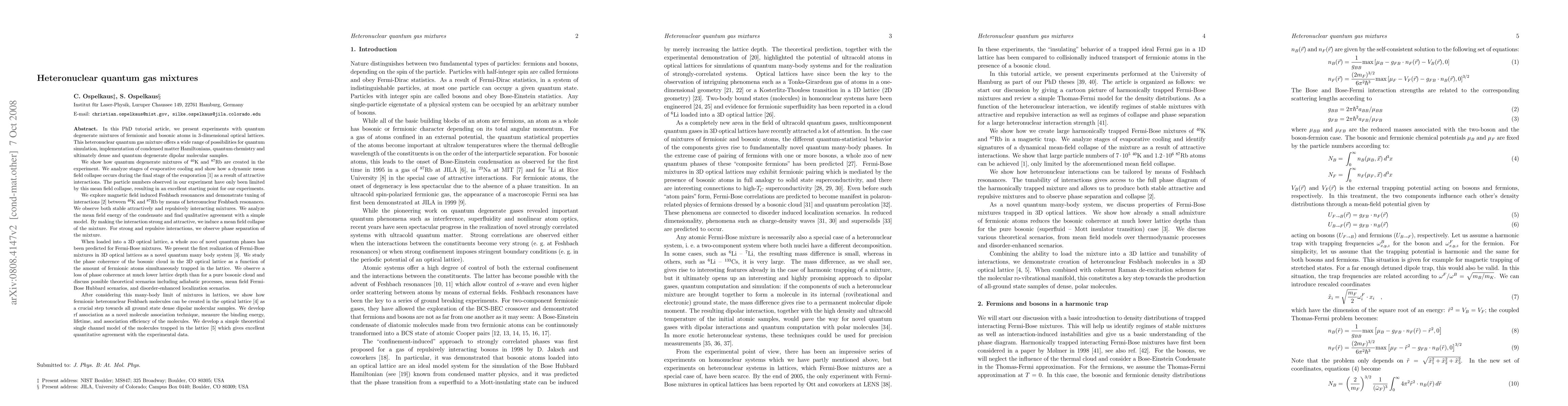 This paper reviews experiments on heteronuclear quantum gas mixtures, focusing on the creation and manipulation of large quantum degenerate mixtures of 40K and 87Rb using heteronuclear Feshbach resonances. The study explores phase separation and collapse, and realizes Fermi-Bose mixtures in 3D optical lattices, presenting the first ultracold heteronuclear Feshbach molecules with detailed analysis of their properties.