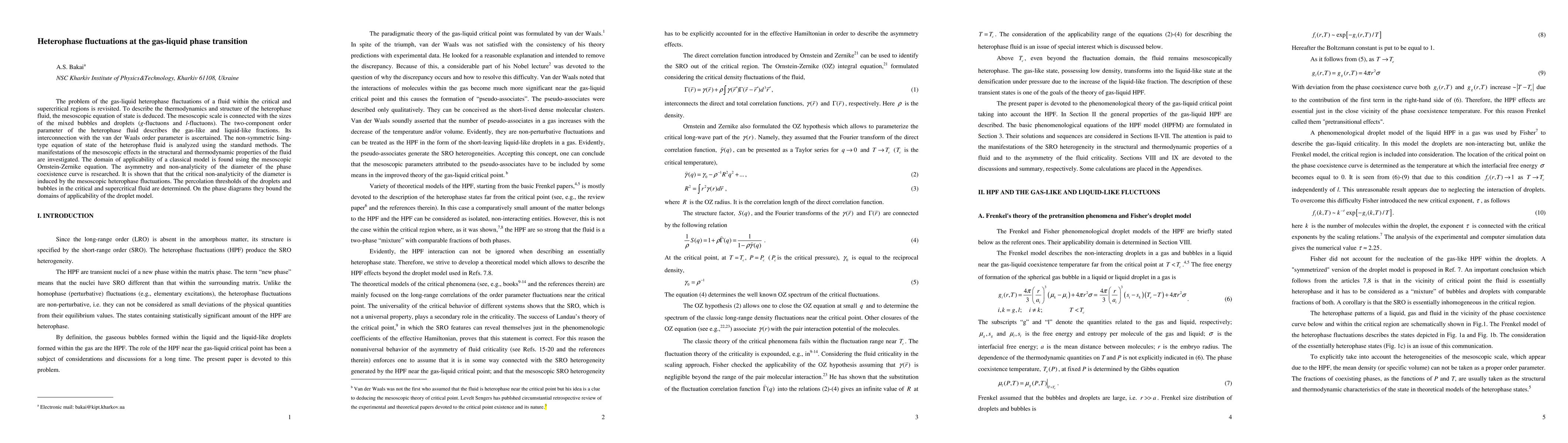 The problem of the gas-liquid heterophase fluctuations of a fluid within the critical and supercritical regions is revisited. To describe the thermodynamics and structure of the heterophase fluid, the mesoscopic equation of state is deduced. The mesoscopic scale is connected with the sizes of the mixed bubbles and droplets (g-fluctuons and l-fluctuons). The two-component order parameter of the heterophase fluid describes the gas-like and liquid-like fractions. Its interconnection with the van der Waals order parameter is ascertained. The non-symmetric Ising-type equation of state of the heterophase fluid is analyzed using the standard methods. The manifestations of the mesoscopic effects in the structural and thermodynamic properties of the fluid are investigated. The domain of applicability of a classical model is found using the mesoscopic Ornstein-Zernike equation. The asymmetry and non-analyticity of the diameter of the phase coexistence curve is researched. It is shown that that the critical non-analyticity of the diameter is induced by the mesoscopic heterophase fluctuations. The percolation thresholds of the droplets and bubbles in the critical and supercritical fluid are determined. On the phase diagrams they bound the domains of applicability of the droplet model.