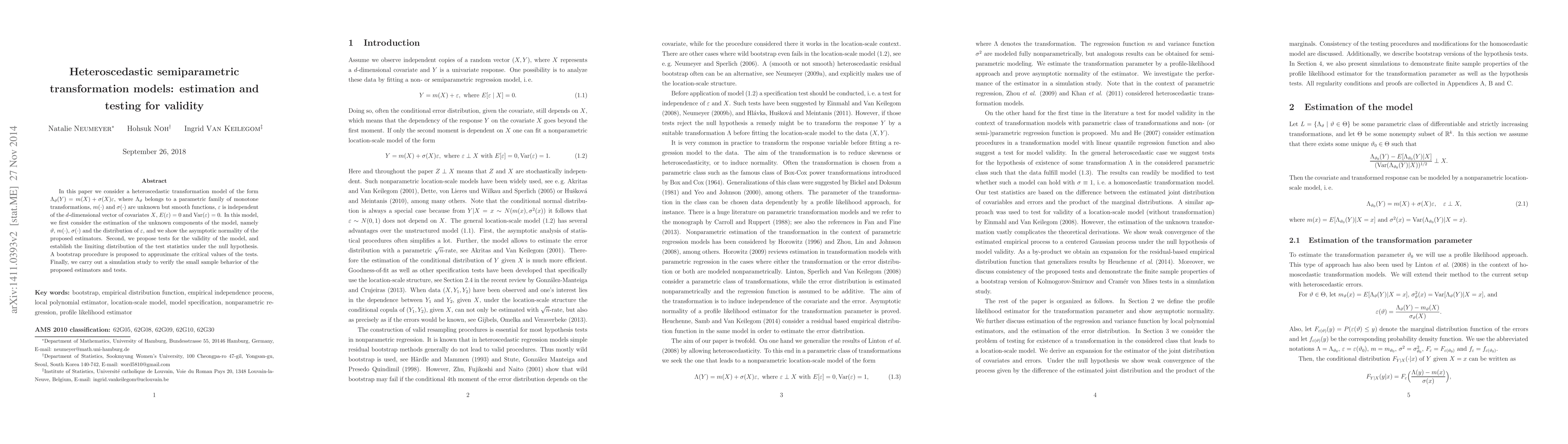 This paper proposes a heteroscedastic semiparametric transformation model for estimating regression and variance functions with asymptotic normality of estimators. It also introduces tests for the model's validity using bootstrap procedures.