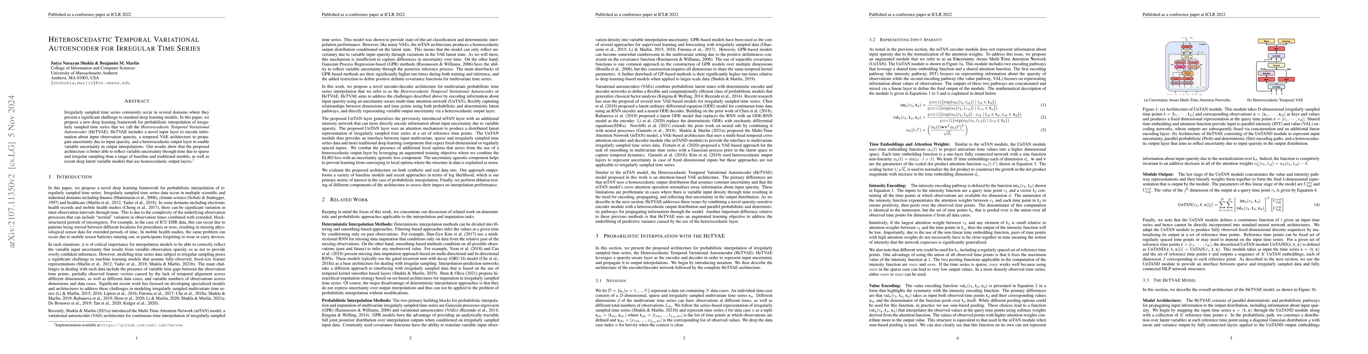 This paper introduces a Heteroscedastic Temporal Variational Autoencoder (HeTVAE) for probabilistic interpolation of irregularly sampled time series, featuring an input layer that encodes observation sparsity, a temporal VAE architecture, and a heteroscedastic output layer for variable uncertainty. The proposed model outperforms baseline and traditional models in reflecting variable uncertainty due to sparse and irregular sampling.