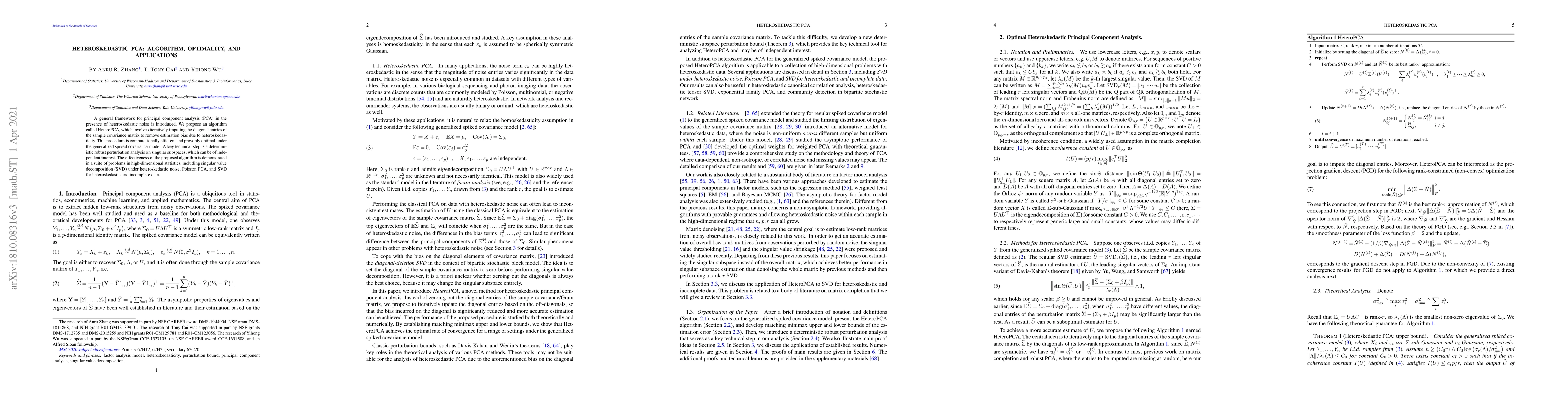 This paper introduces HeteroPCA, an algorithm for principal component analysis in the presence of heteroskedastic noise, which iteratively corrects the sample covariance matrix to mitigate estimation bias. The algorithm is shown to be optimal under the generalized spiked covariance model and is effective in various applications including SVD under heteroskedastic noise and Poisson PCA.