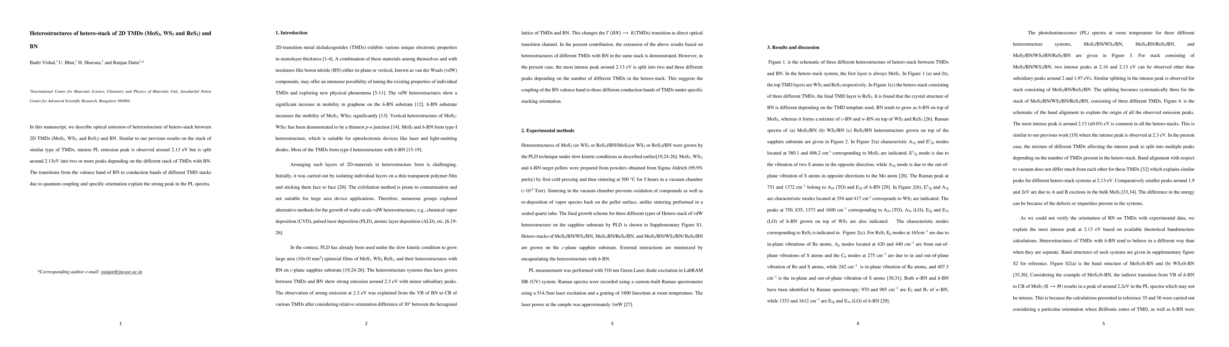 This paper investigates the optical emission of heterostructures formed by stacking 2D TMDs (MoS2, WS2, and ReS2) with BN, observing intense PL emission peaks around 2.13 eV that split into multiple peaks based on the TMD-BN arrangement. Quantum coupling and specific orientation between BN's valence band and TMDs' conduction bands explain the observed strong peaks.