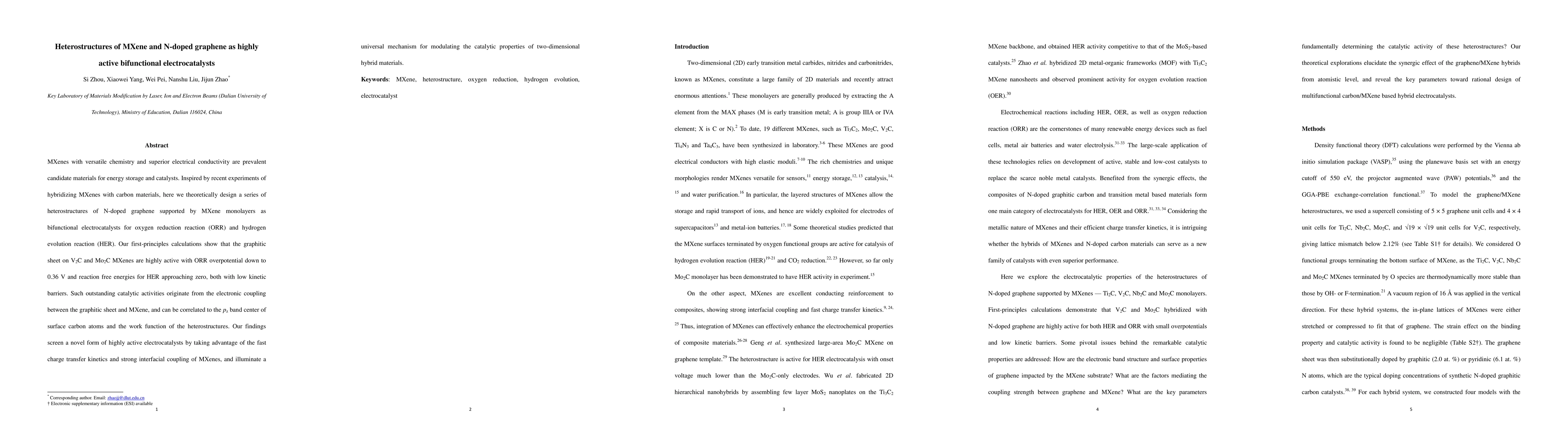 The paper presents a theoretical design of MXene-supported N-doped graphene heterostructures as efficient bifunctional electrocatalysts for ORR and HER, highlighting the role of electronic coupling and surface charge redistribution.