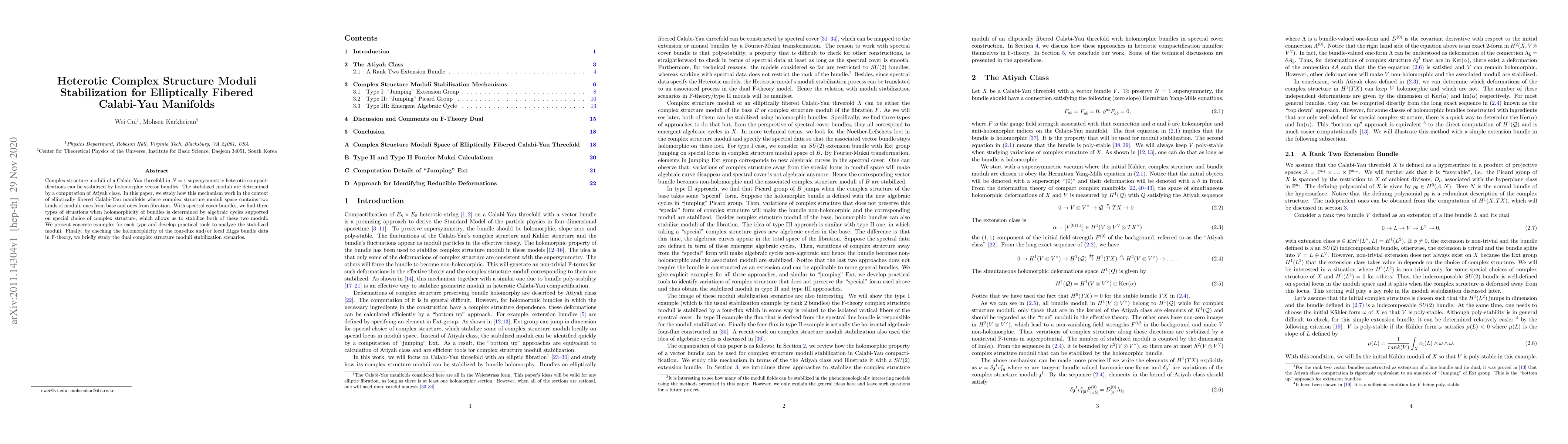 This paper explores the stabilization of complex structure moduli in elliptically fibered Calabi-Yau manifolds using holomorphic vector bundles, identifying conditions for their holomorphicity and presenting practical tools for analysis, with examples and a brief study of dual complex structure moduli stabilization in F-theory.