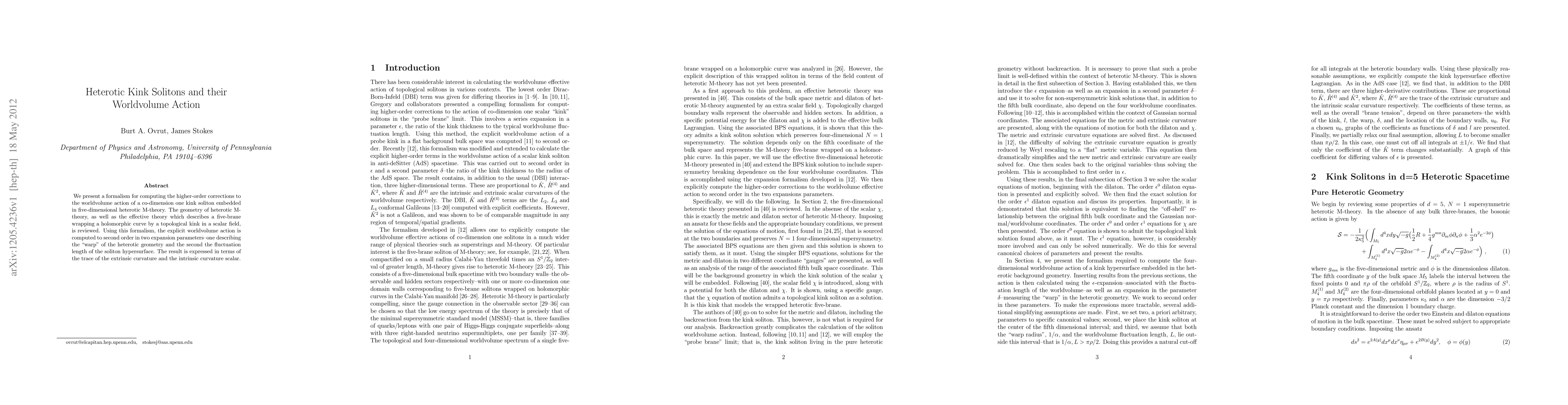 We present a formalism for computing the higher-order corrections to the worldvolume action of a co-dimension one kink soliton embedded in five-dimensional heterotic M-theory. The geometry of heterotic M-theory, as well as the effective theory which describes a five-brane wrapping a holomorphic curve by a topological kink in a scalar field, is reviewed. Using this formalism, the explicit worldvolume action is computed to second order in two expansion parameters--one describing the "warp" of the heterotic geometry and the second the fluctuation length of the soliton hypersurface. The result is expressed in terms of the trace of the extrinsic curvature and the intrinsic curvature scalar.